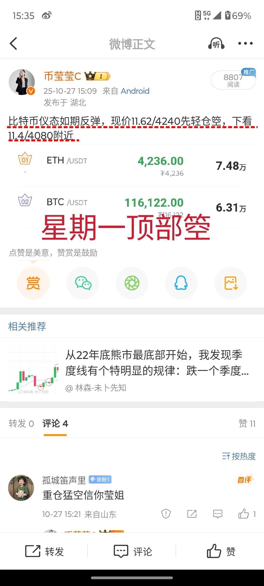 10月底的一周胜率达到90%-95%,所有的策略大家都是有目共睹。我们不追求單多,只追求稳中求胜……比特币btc区块链