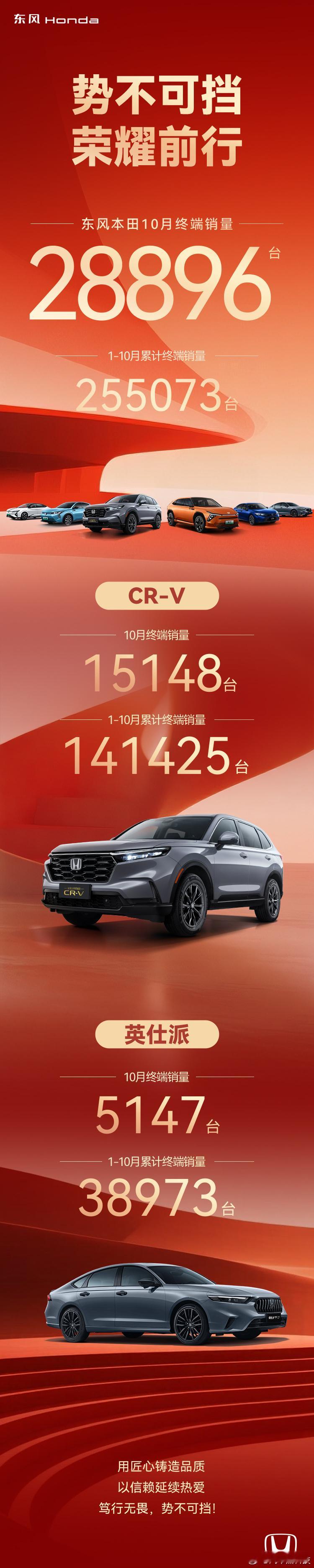 东风本田10月销量28896台 11月2日,东风本田公布,2025年10月终端销量28896台,1-10月累计终端销量255073台。其中,CR-V车型10月终端销量15148台,1-10月累计终端销量141425台;英仕派10月终端销量5147台,1-10月累计终端销量38973台。