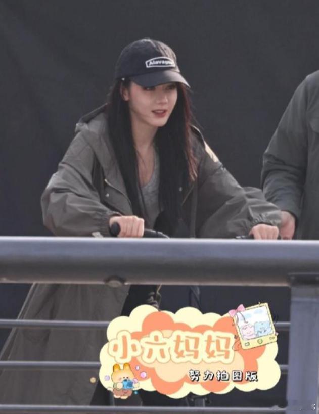 迪丽热巴卫蓝自行车路透有网友偶遇了迪丽热巴新剧拍摄,热巴穿着风衣戴着棒球