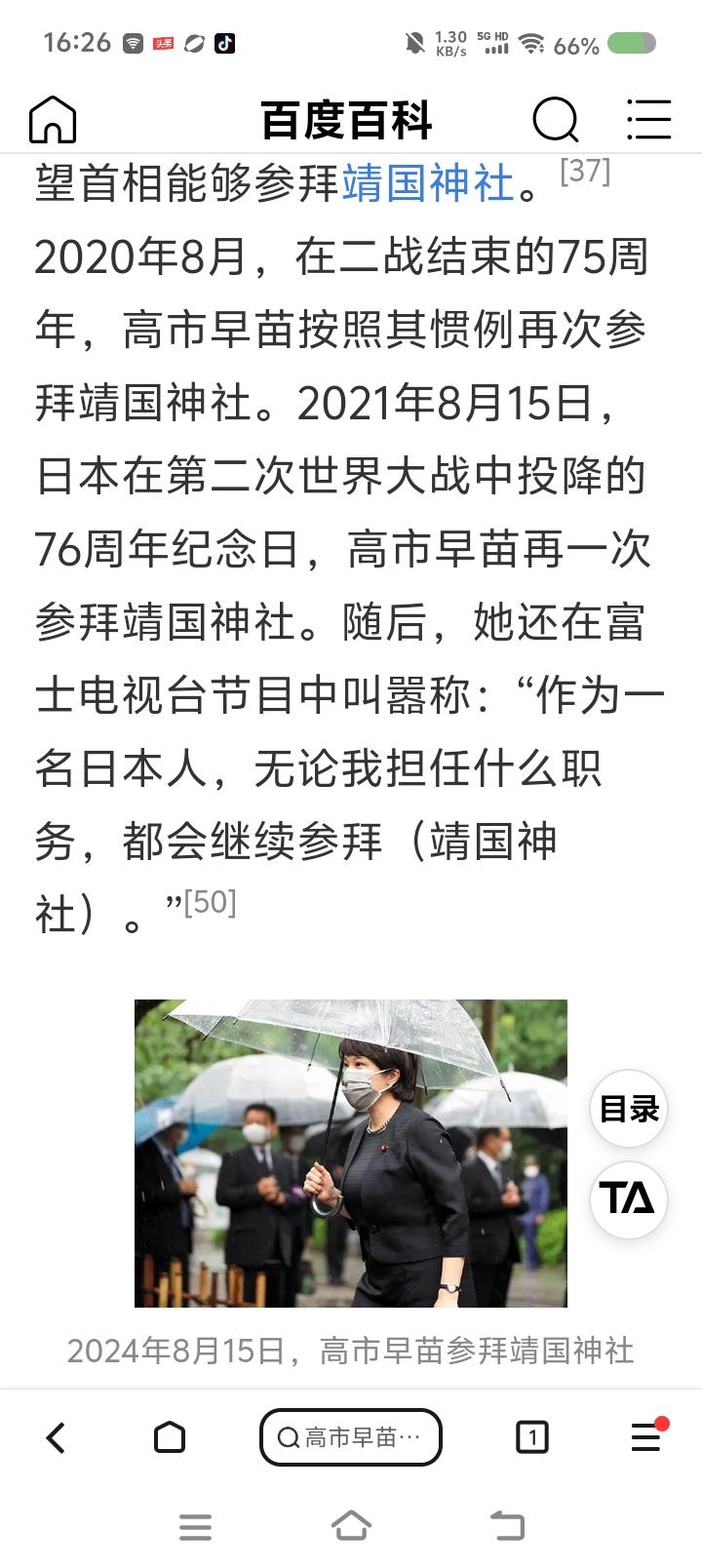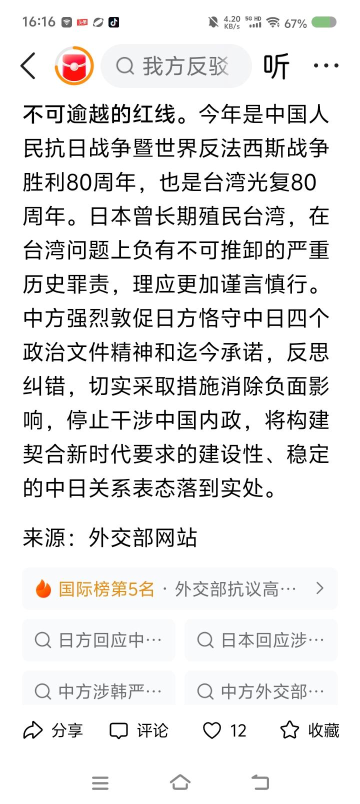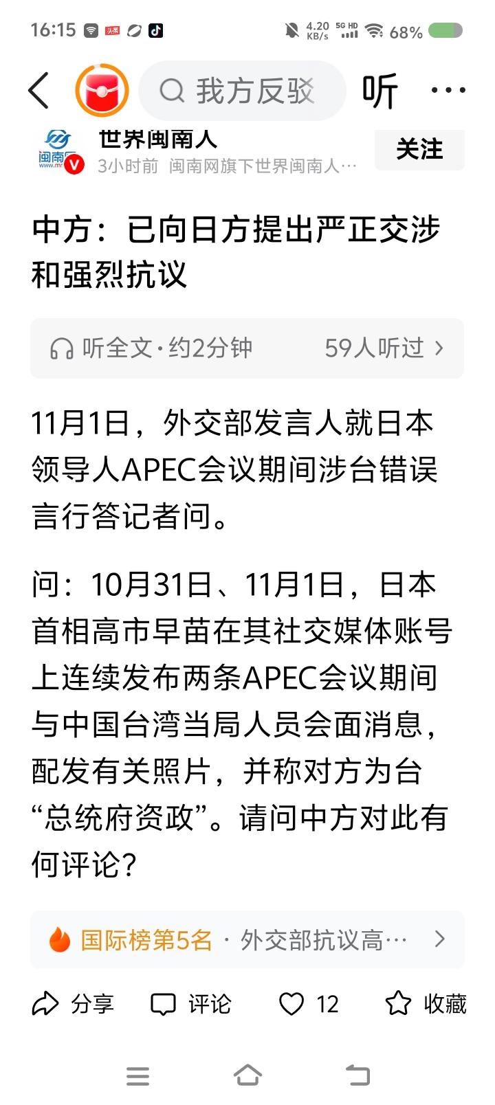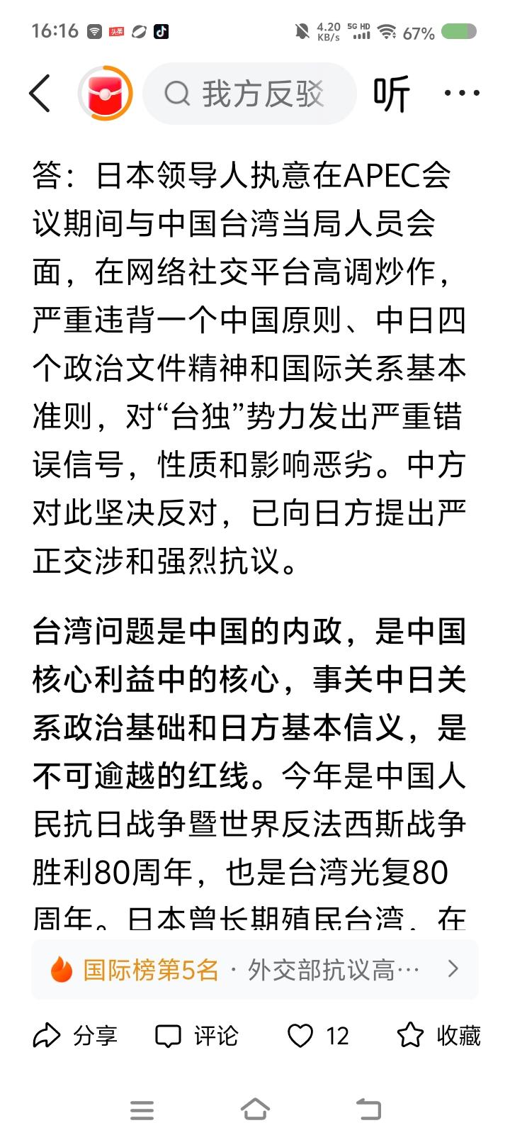 高市早苗,你想干什么?—— 据报道,近日,在韩国举行的APEC会议上,日本首相高市早苗与中国台湾代表不当接触,且发布会面信息,含错误称谓。我外交部已向日本交涉,发言人已答记者问。 点评: 逆历史潮流,不自知不自省,亡之不远矣! 资料显示:上世纪90年代,高市早苗称赞希特勒的选举策略。历史问题上,高市早苗否认日本侵略历史,多次参拜靖国神社。