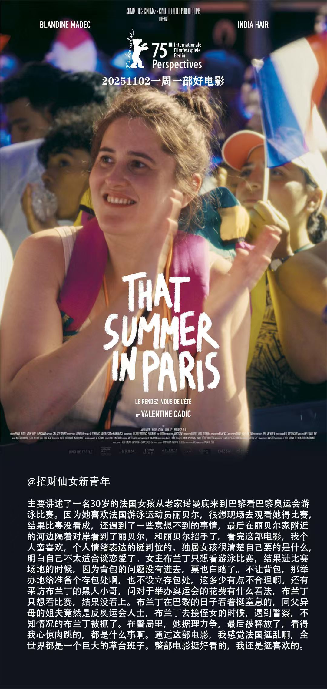 2024年夏天,30岁的布兰丁从诺曼底前往巴黎,她想看奥运会游泳比赛,她想现场给自己的偶像贝丽尔加油,可惜因为票出了问题,她未能如愿。她跟多年未见的同父异母的姐姐重逢,却发现对方的生活一团糟乱。。。在巴黎的一周时间,布兰丁似乎一直过着被打乱原本计划的生活,她也迷茫,却努力微笑着向前。。。知道她要离开巴黎的那天清晨,远远看到偶像贝丽尔跟她挥手打招呼,她心满意足的笑了,这趟巴黎之旅并非一无所获。