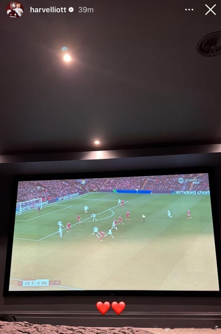 埃利奥特本人没有随维拉前往安菲尔德,他是在家中看的这场球,还发了ins埃利奥特已