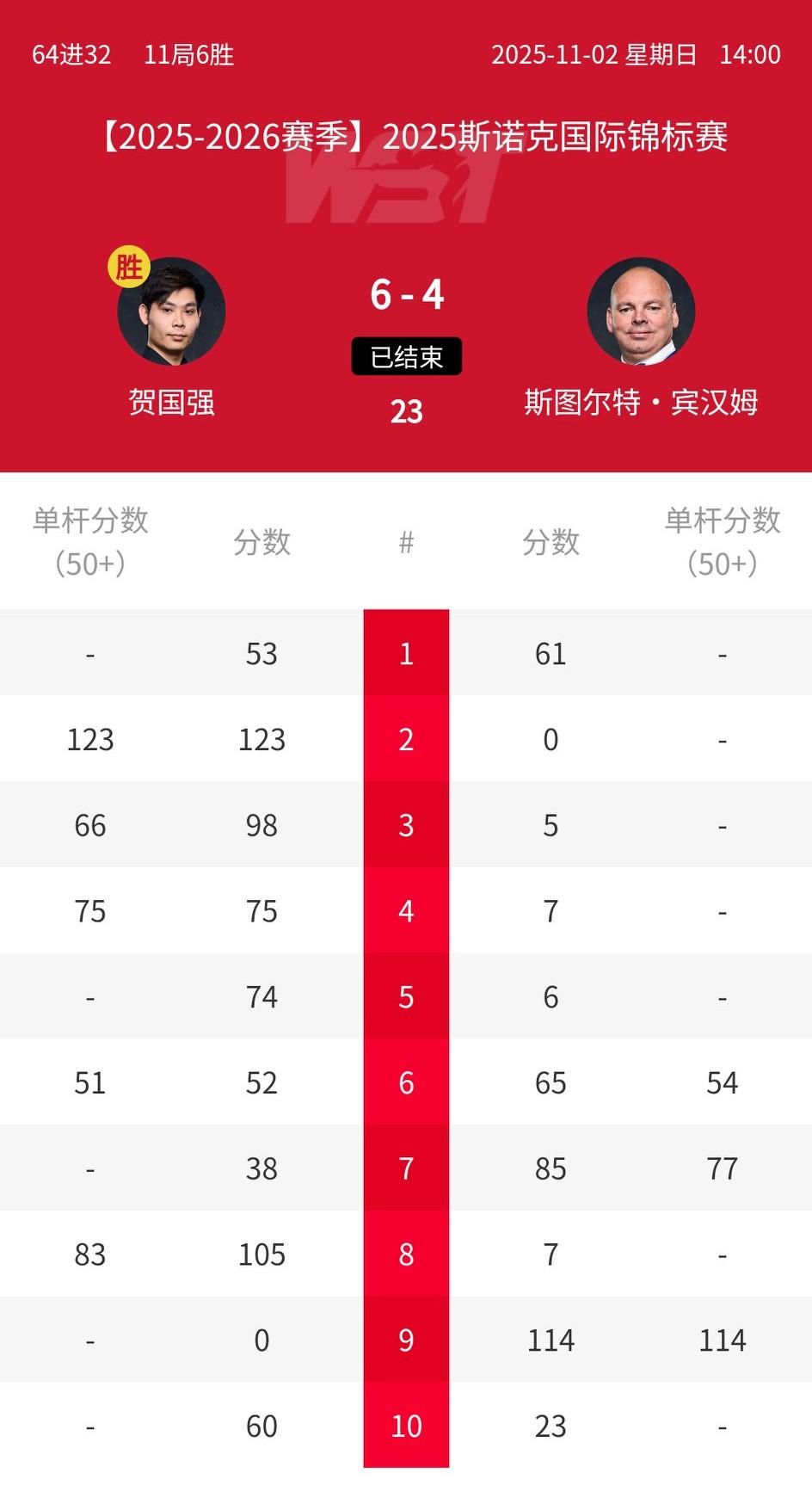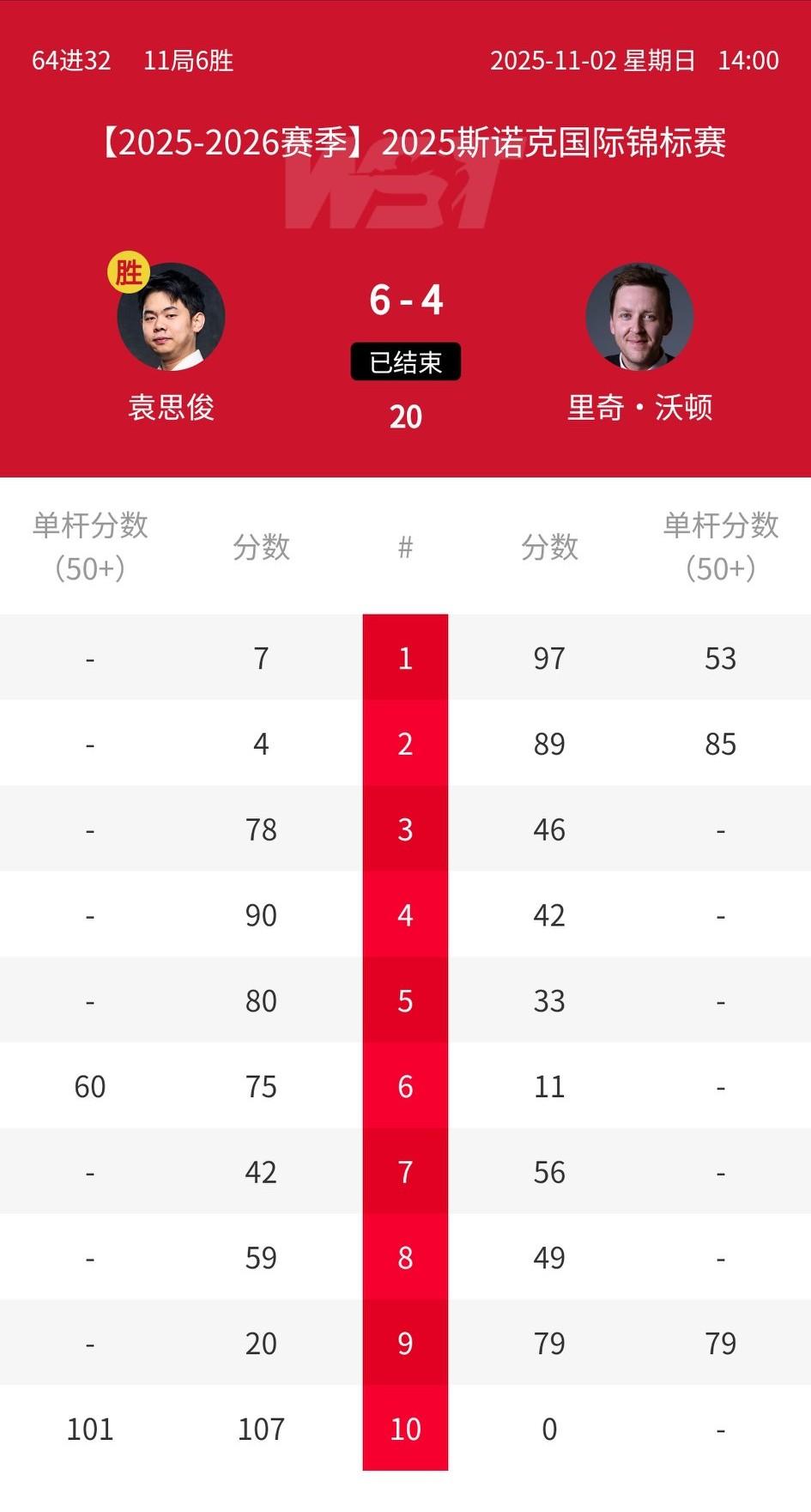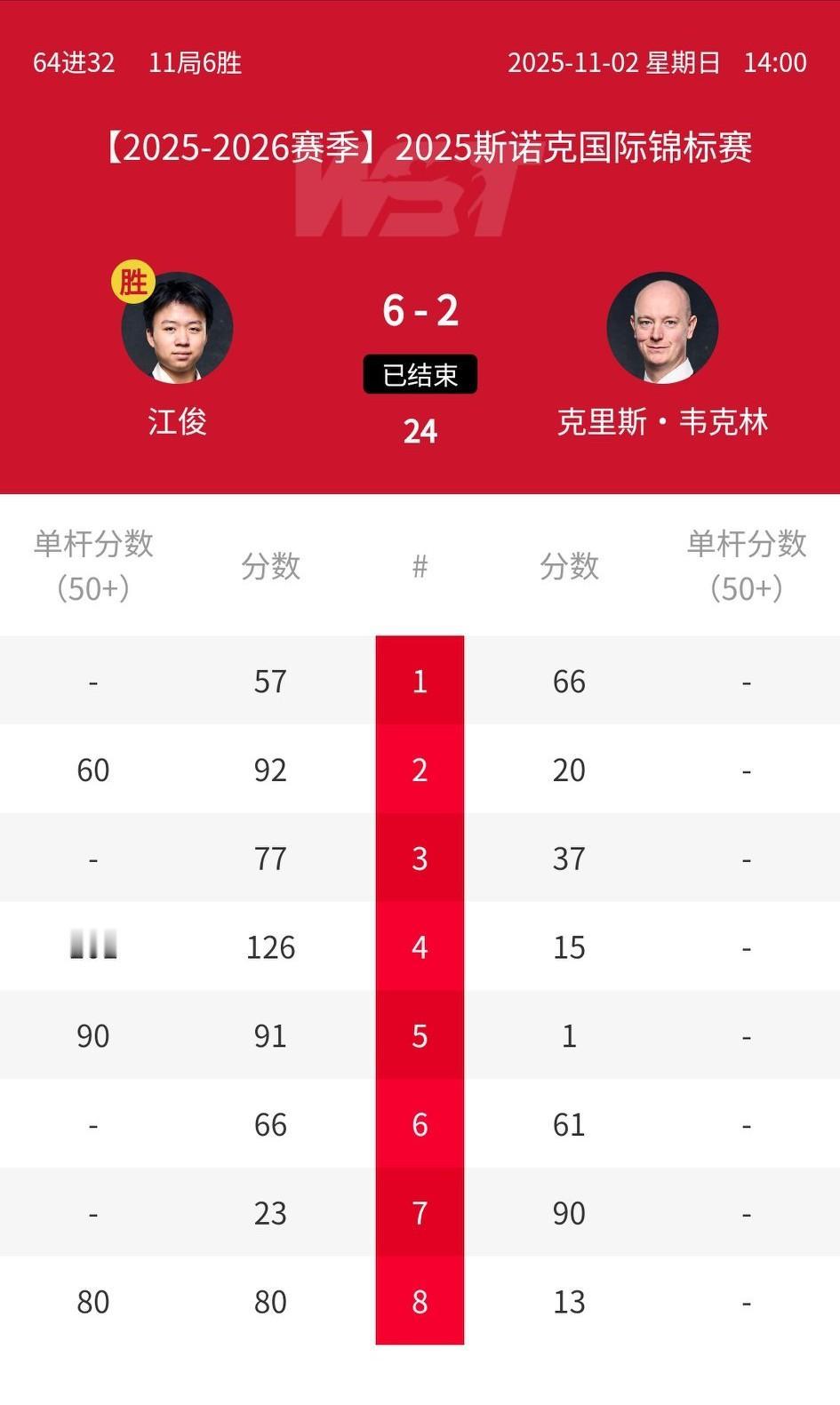 2025斯诺克国锦赛64进32轮次,刘宏宇遭塞尔比绝杀,江俊、袁思俊、国强3名中国球员率先晋级。 塞尔比6-5刘宏宇 袁思俊6-4里奇沃顿 江俊6-2沃克林(沃克林是上届国锦赛亚军) 国强6-4宾汉姆(宾汉姆是世界冠军)