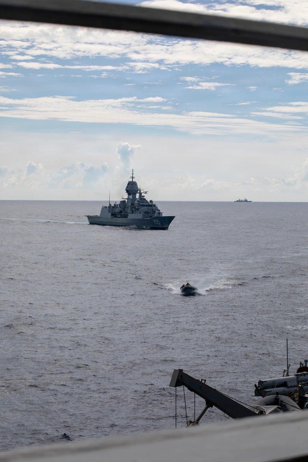 “船多真好!”美澳新菲南海军演,果然少不了中国海军“街溜子舰”,815A电子侦察舰。11月2日,菲律宾方面公开了,在美澳新菲四国海军力量在南海军演,澳大利亚海军巴拉特纳号护卫舰的背景中,突然钻出来一艘中国海军815A电子侦察舰,对美澳新菲四国舰队实施电子战。“这次给他们(美澳新菲四国海军力量)播放什么儿歌”?,“拔萝卜,拔萝卜,嘿哟嘿哟拔萝卜”?“喜羊羊美羊羊慢羊羊灰太狼”?在11月1日,美国、澳大利亚、新西兰和菲律宾在南海进行所谓“海上合作活动”联合军演期间,菲律宾记者拍摄到了中国海军052D驱逐舰,美澳新菲共出动4艘海军舰艇,现场中国海军水面作战舰艇至少5艘,如今算是815A电子侦察舰,一共6艘军舰,围观四国南海军演。既然美国,菲律宾,澳大利亚,新西兰海军,没有邀请我们参加,但是我们硬要参加!舰多真好,5年后就算整个北约一起来也会发现自己舰船数量太少!现在中国海军驱逐舰数量,051系列、052系列、054系列以及055等主力驱护舰加起来破百艘了,甚至052D驱逐舰都可以当通用驱逐舰。 对于这一次海上军演,美国海军出动了菲茨杰拉德号驱逐舰,澳大利亚海军巴拉特纳号护卫舰,新西兰海军奥特亚罗瓦号补给舰,菲律宾海军何塞·黎刹号护卫舰,并且还有美国海军尼米兹号航母在黄岩岛附近坐镇,就是那艘刚刚在南海,损失两架舰载机,海鹰直升机,F/A-18E/F“超级大黄蜂”舰载机的尼米兹号航母。此外还包括菲律宾空军出动A-29B超级巨嘴鸟、C208B侦察机等。中国海军舰队距离美澳新菲舰艇,最近距离为3海里。而菲律宾何塞·黎刹号护卫舰军官安德烈斯中校叫嚣:“如果我们遇到外国入侵,一定会予以反击”。 美国海军尼米兹号航母位于黄岩岛以南海域,美国海军尼米兹号航母并未离开南海,11月1号,位于黄岩岛附近,支持美澳新菲四国的南海演习。菲律宾当局在美国的教唆下,一直想让我们打他,掉进他们的陷阱里,这样他们就能呼吁全世界抵制我们。对待菲律宾这样反复跳梁小丑,期待国家重拳出击,以震霄小,以平南海之态势,以解收台时四面之危!