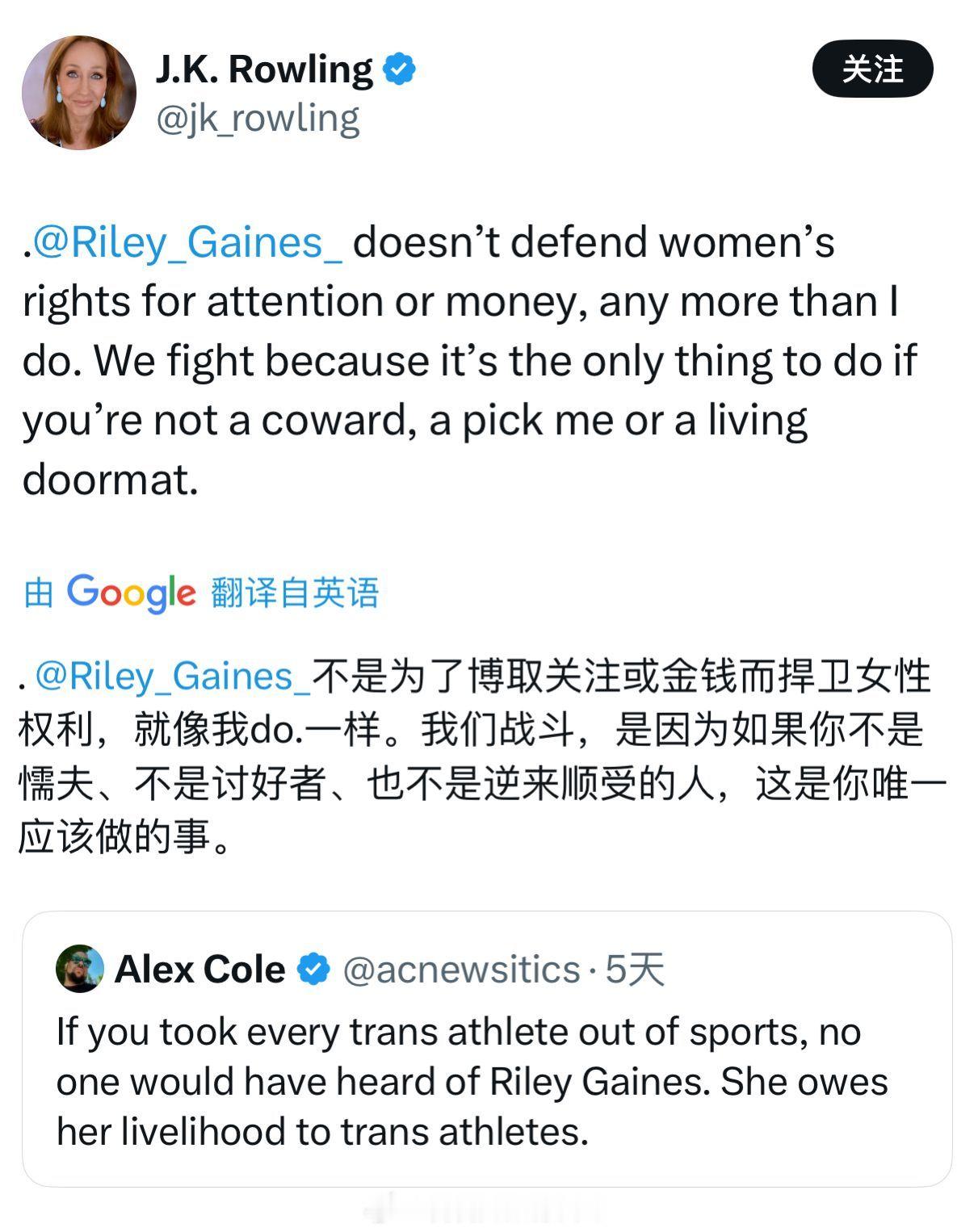 有人质疑时,jk罗琳表示,她不是为了博关注和金钱而捍卫女性权利。