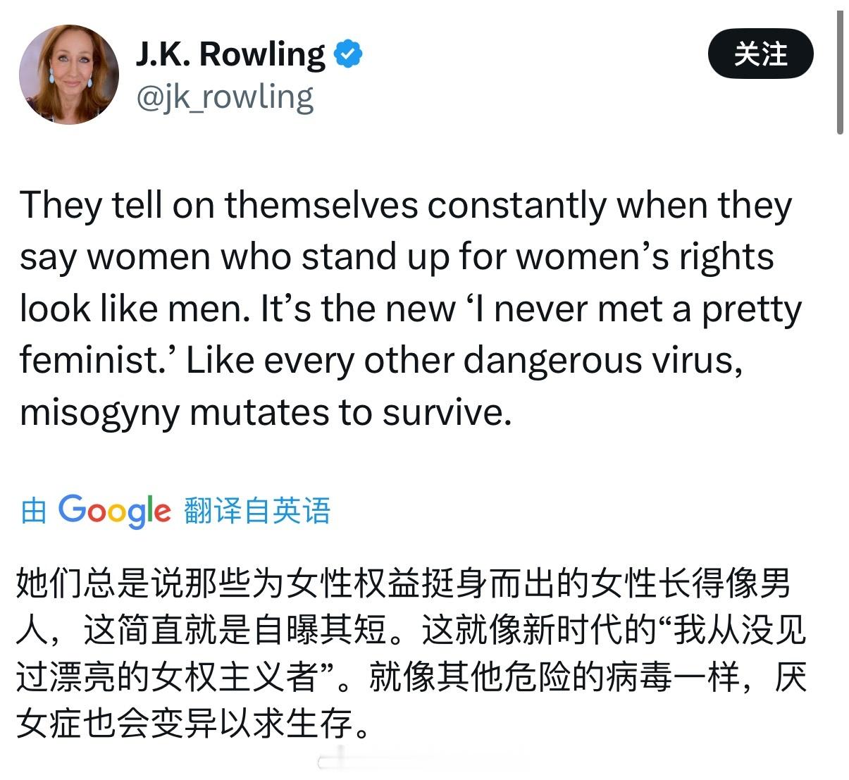 JK罗琳发文反对:我成长的年代,主流杂志告诉女性,她们要更漂亮更瘦。现在主流女性杂志告诉女孩们,男人比她们更像女人。