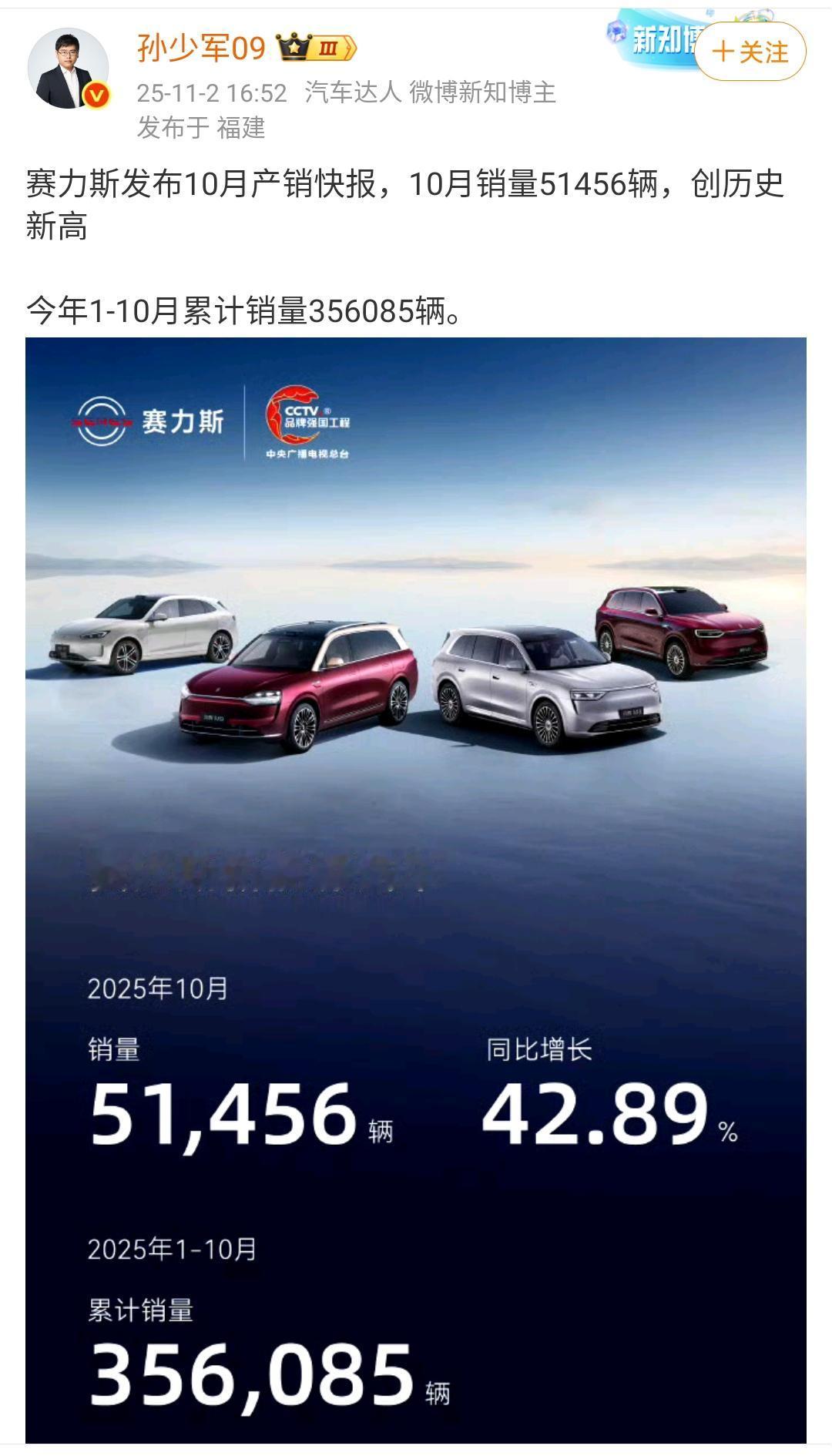 孙少军:赛力斯发布10月产销快报,10月销量51456辆,创历史新高! 今年1-10月累计销量356085辆,这个数据并非全部都是问界品牌的,还有少量的蓝电,也就是赛力斯旗下主打性价比的品牌,这个品牌绝大多数人都不知道。 各位是怎么看的?欢迎评论区留言。