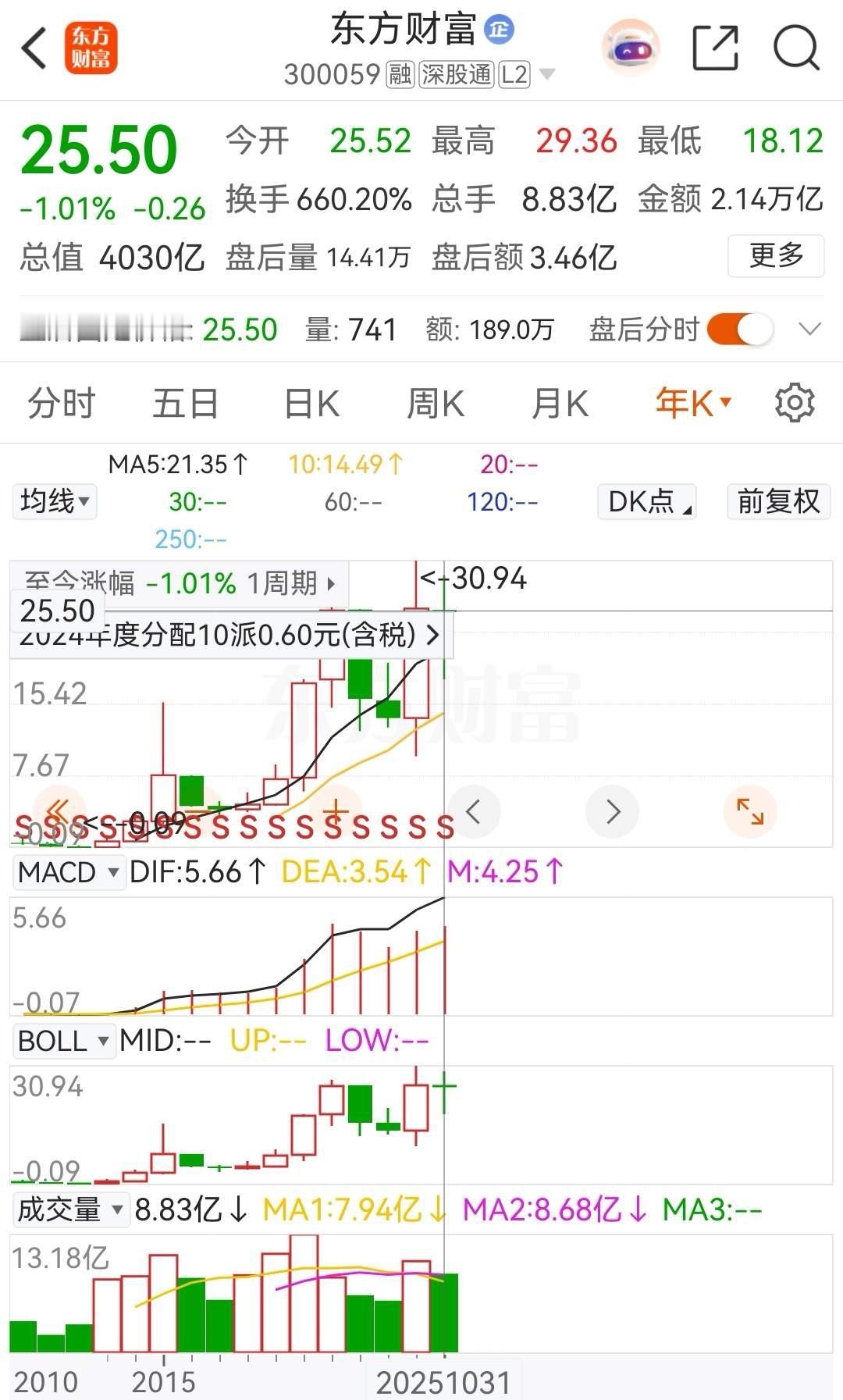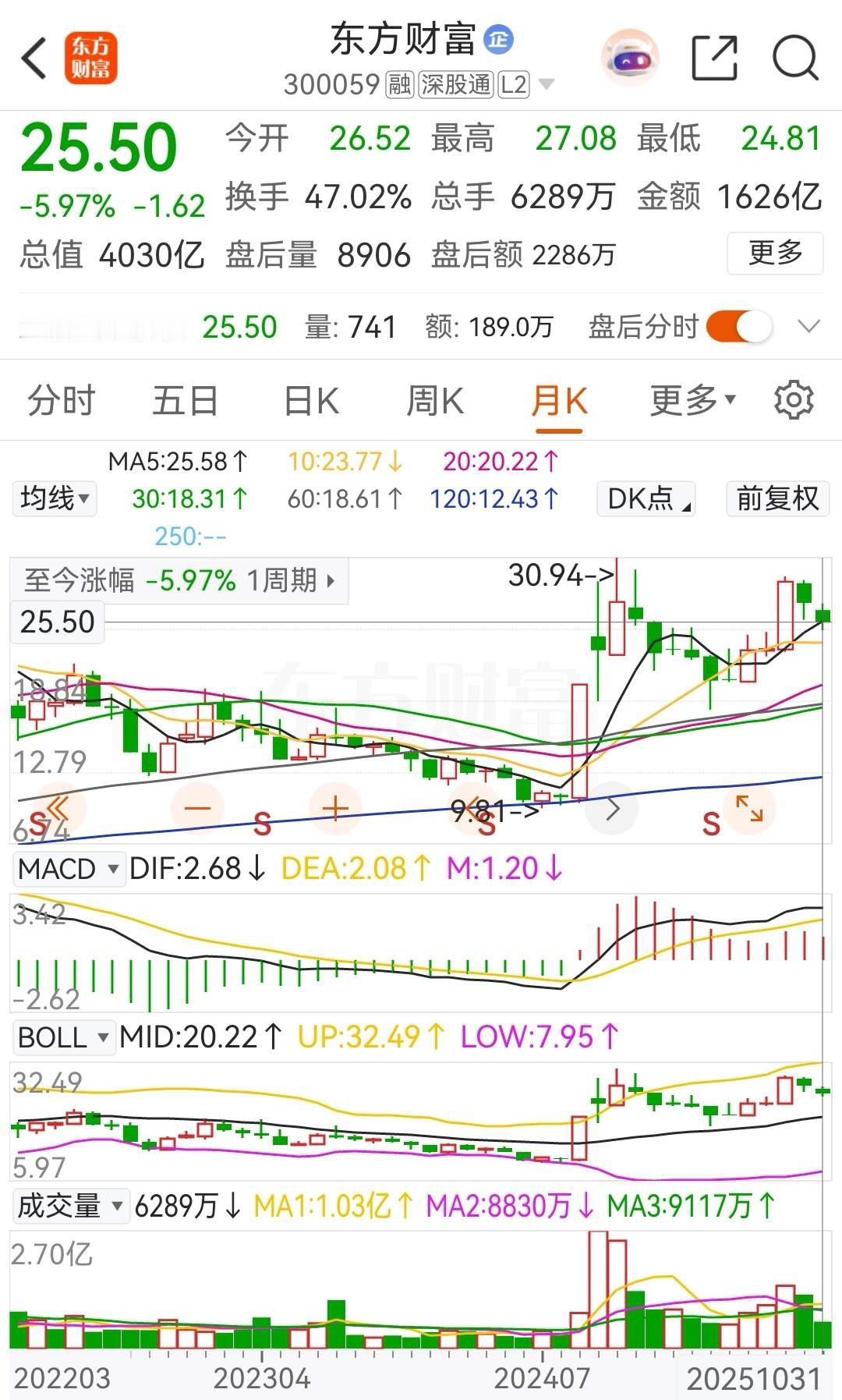 东方财富今年的涨幅竟然是-1.01%,估计年初是很多人都没有想到吧!自从08月29日创出年内最高价29.36元后,东方财富开启了一轮长达两个月的调整,截止当前为止,东财的报价为25.50元,总市值为4030亿元。从走势上看,日线级别上股价再次跌穿各条均线,这就是东方财富当前的走势情况。