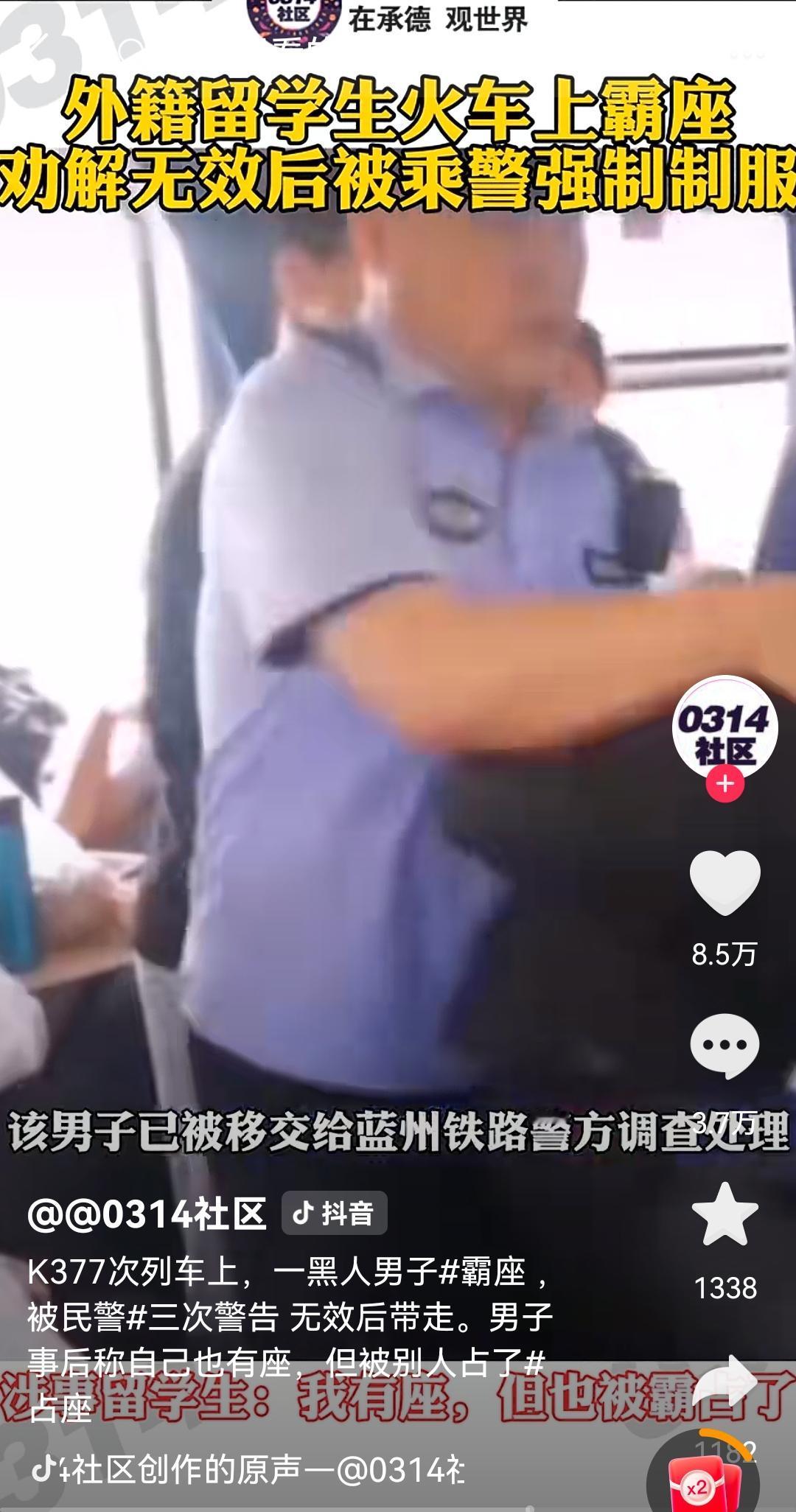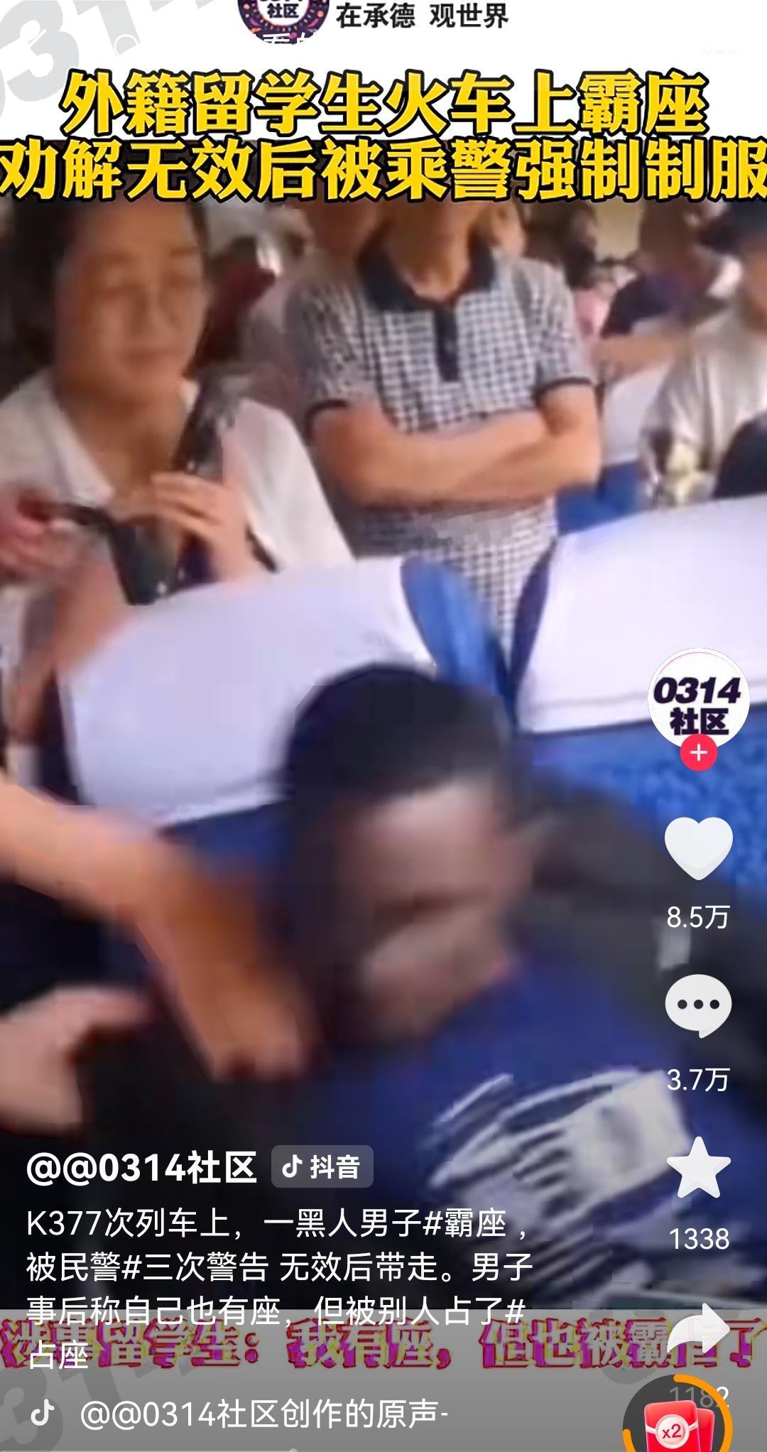 自取其辱!黑人留学生火车上占位不听劝被强制带走 K377次列车上,一位旅客上车后发现自己的位置上有位黑人占着位,于是就上前与其勾通说,这位置是他的,并拿着车票向黑人解释,黑人听后根本不予理睬,还嬉皮笑脸的说着听不懂的话。 旅客气不过就找来乘警希望主持公道,乘警来后拿着旅客的车票与座位对比一下,确认是黑人霸座就对黑人用标准的普通话进行沟通,希望黑人遵守列车乘车规则,把位置让出来回到自己的位置上去,黑人听了乘警的话后仍然是不理睬,和之前的嬉皮笑脸态度一样。乘警同志看黑人怎么劝说都无动于衷就对其进行警告。也不知道黑人是什么心态,也不知道他依仗着什么,反正就是霸着位置不听劝。乘警同志在三次警告无效后直接上去把黑人强制带走。 后来据知情人士透露,黑人是来华留学生,有票,可能是发现他的位置有人还是怎么的就随便找一个位置就坐下来了。没想到黑人留学生遇到一个较真的旅客非要坐自己的位置,而黑人留学生却不把旅客的要求当回事。特别是当乘警同志来的时候,态度更是有挑衅的味道,所以结局很完美。 在这想到前两天同样发生在火车上霸位的事,说是一位印度三哥上车后“不问自取”强占卧铺睡觉,而卧铺原主人因为担心语言不通选择“多一事不如少一事”的忍隐方式冷处理解决热起了热议。 这两件事不做关联猜想,只想说,如果大家对一些人的霸座选择了忍隐,那么肯定会助长他们以为有“特权”的思想。以上两位外籍人士霸座的态度就看得出来,连乘警同志出来劝说都不听,一点也没把中国法律法规放在心上。这些人能如此嚣张跋扈,是什么原因引起的?真的值得深思一下了! 再看看咱们乘警同志的处理方式,全程不会因为你是外籍留学生就改变执法流程和方式,也不会因为语言不通而选择放弃沟通。来到中国,你听不懂中文是你的事,不遵守中国法律法规就得依法处理,没有任何可以妥协的讲法! 为这位乘警同志点赞!