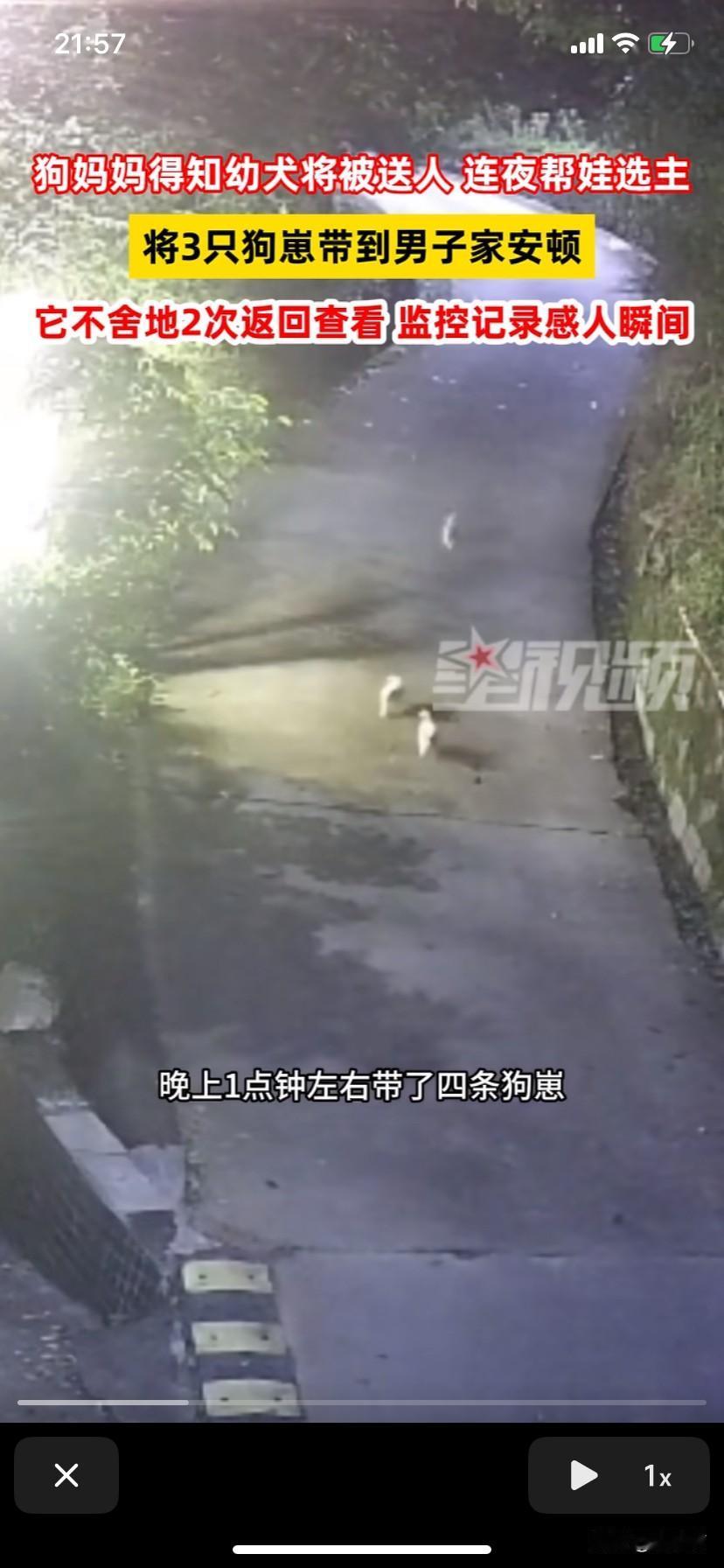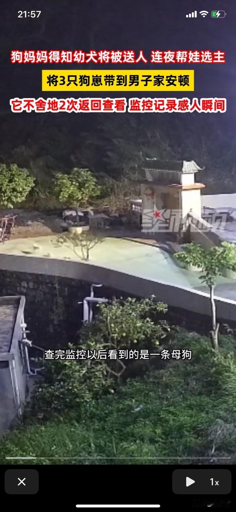 广东揭阳,狗妈妈得知主人要把幼犬送走,连夜带着狗崽到男子家安顿。监控更是记录下感人的瞬间。 男子一早接到妈妈打来的电话,在电话里妈妈告诉男子家里突然来了三只可爱的小狗崽。为了弄清楚三只小狗崽是怎么回事,男子特意查看了家里的监控。 在监控记录下来的画面中,男子看到在夜里的一点左右,有一条母狗带着四只小狗崽在自家门口徘徊了四个小时。期间母狗久不久的用嘴巴拱拱狗崽,好像在叮嘱一些话。 临了,母狗回去的时候,其中三只小狗崽留在男子家门口,另外一只小一点的小狗崽则跟着母狗走。 母狗一步三回头的看着留下来的三只狗崽,虽然心里不舍得,但它还是坚定的带着另外一只小狗崽离开。 男子仔细查看监控时发现母狗带着四只小狗崽是从房子旁边的小路走来的。他觉得这狗子应该是附近的乡亲家养的。 想到这里,男子一一打电话询问。经过多次询问,男子终于找到了狗主人。男子向狗主人说明缘由,狗主人听后觉得不可思议。 狗主人对男子说:我家母狗生了四只狗崽,我觉得太多了,养不下,想要把狗崽送走。我说这话的时候,母狗就在旁边,当时它也没有什么其他的大反应。 我没有想到它竟会连夜带着狗崽到你那里。看这样子,母狗应该是觉得你家是好人家,它把狗崽送到你家里养,它放心。 男子得知这细节后,心里又感动又开心。更让男子触动心弦的是狗妈妈在早上和下午两次来到自家门口远远的望着三只狗崽。当它看到三只狗崽在院子里快乐的玩耍,它又放心的离开。 可怜天下父母心,这母爱不分物种。也许狗妈妈 在听到主人要送走狗崽时,它不知道主人会把狗崽送到什么样的家庭。它心里又着急又担心。 所以它连夜带着狗崽送到了男子的家里。在它心里,它觉得把狗崽托付在男子家,它放心。 多有灵性的狗妈妈。为了狗崽幸福安稳的生活,它也是费了一番心思。俗话说狗来富,狗妈妈选定的人家必定是有爱心又善良的有福报之人。