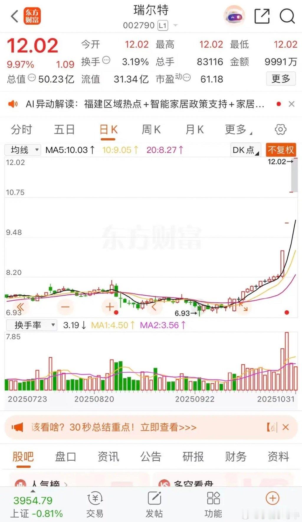瑞尔特涨停板收盘报收12.02元每股,成交金额9991万元,4板涨停,牛气冲天。