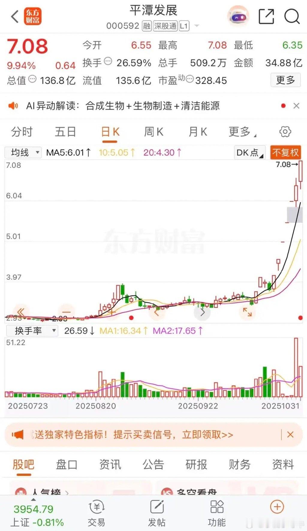 平潭发展涨停板收盘报收7.08元每股,成交金额34.88亿元,11天8板涨停,涨涨涨涨,强者恒强。周一涨停7.79元每股。