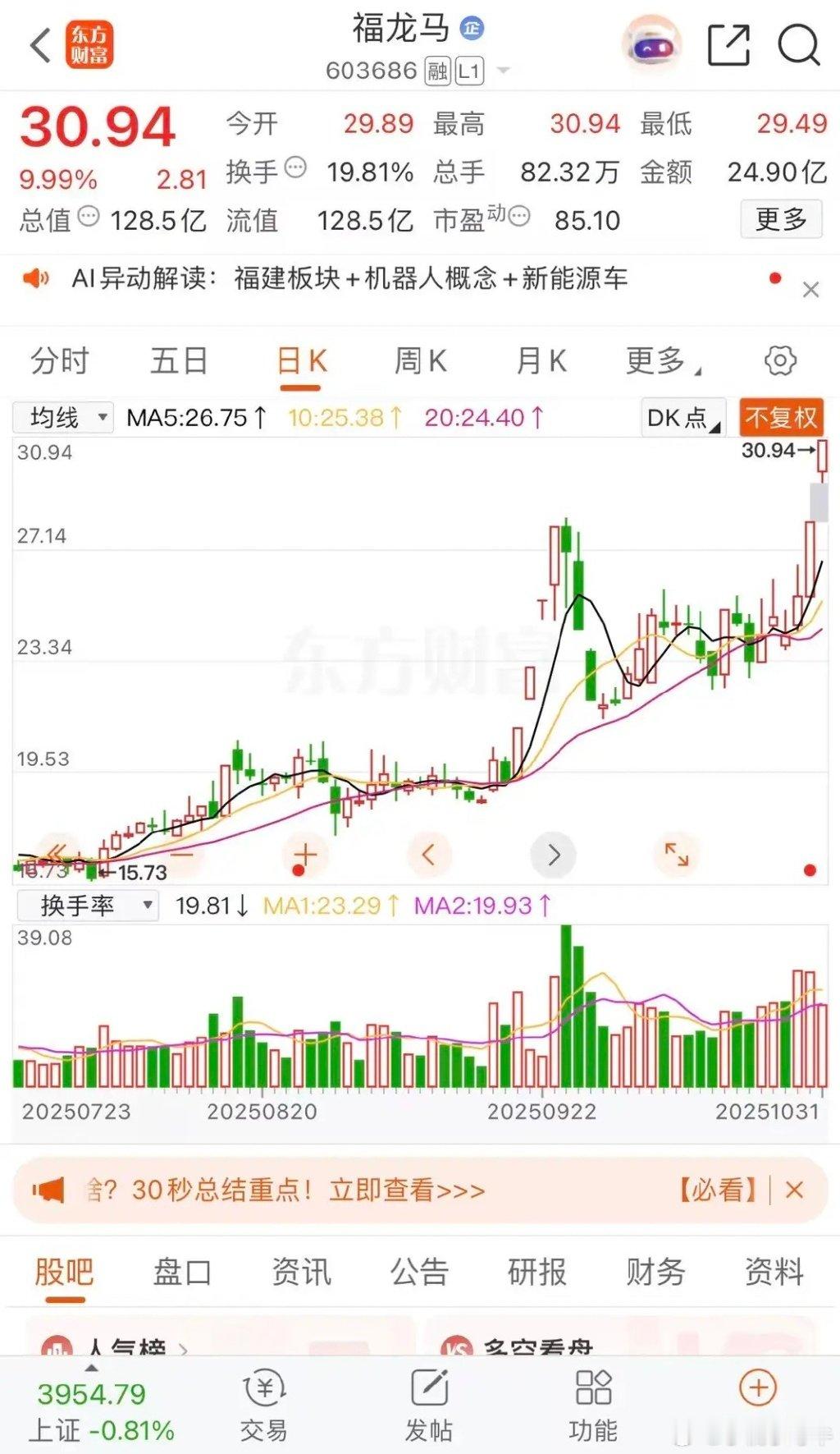 福龙马涨停板收盘报收30.94元每股,成交金额24.90亿元,2板涨停板,3板比较难。