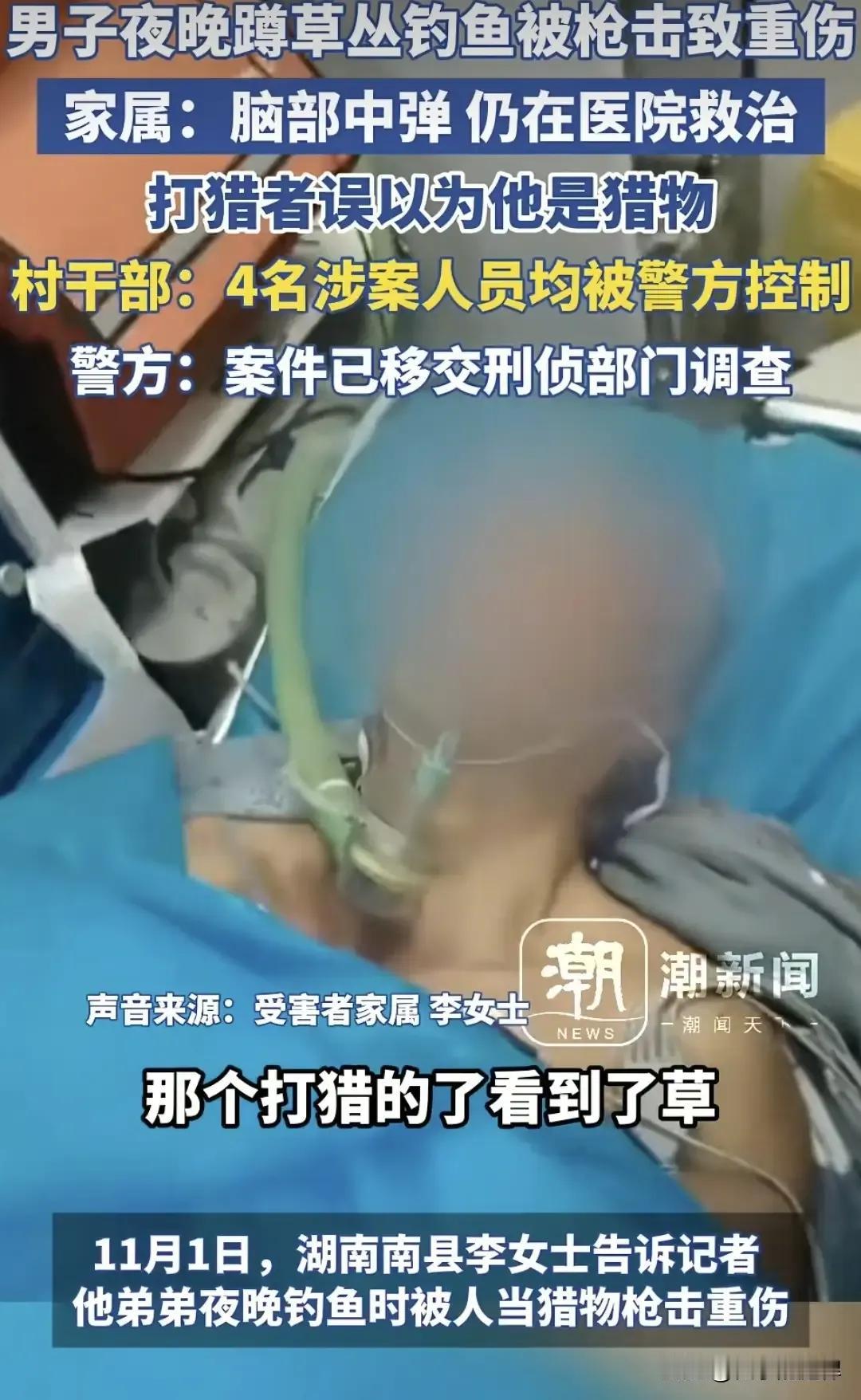 湖南南县一名男子夜间在草丛中钓鱼时,被4名同样在夜间狩猎的人误当作猎物,开枪击中头部,导致重伤,目前仍在医院抢救,情况不容乐观。 更讽刺的是,家属在悲痛中还要面对如此苛刻的条件——先原谅,再救命。这不仅是对伤者的二次伤害,更是对人性的一次拷问。 希望伤者能够早日康复,也希望相关部门能够彻查此事,给受害者和公众一个交代。