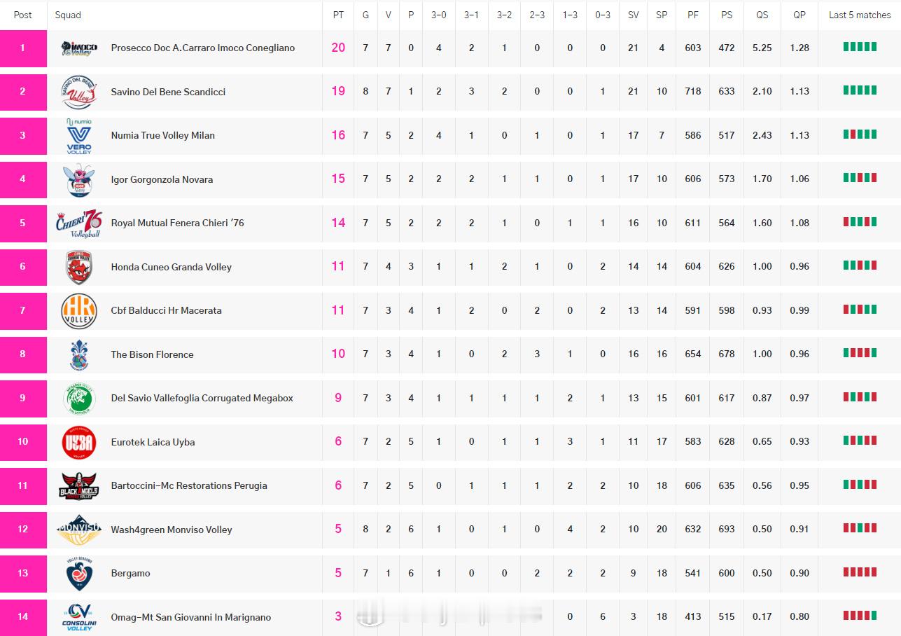 【意甲女排最新积分榜】国际排坛战报速递11月2日,意甲女排第七轮战罢,卫冕冠军科内利亚诺七连胜20分继续独自领跑,多赛一场的斯坎迪奇7胜1负19分紧追不舍,米兰、诺瓦拉和基耶里同为5胜2负暂列3-5位,圣乔瓦尼和贝尔加莫1胜6负排名倒数两位。