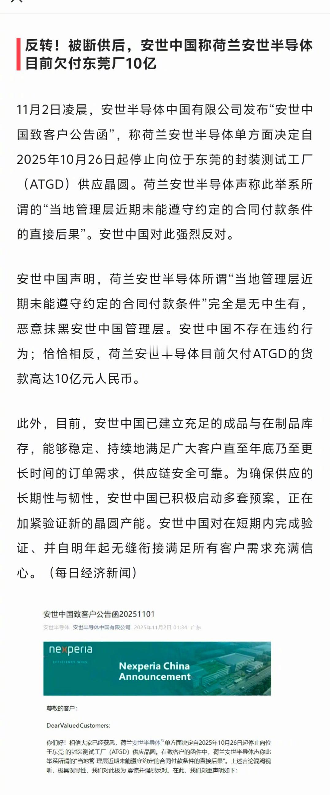 安世中国称荷兰安世半导体目前欠付东莞厂10亿人民币