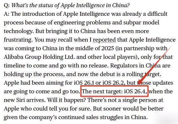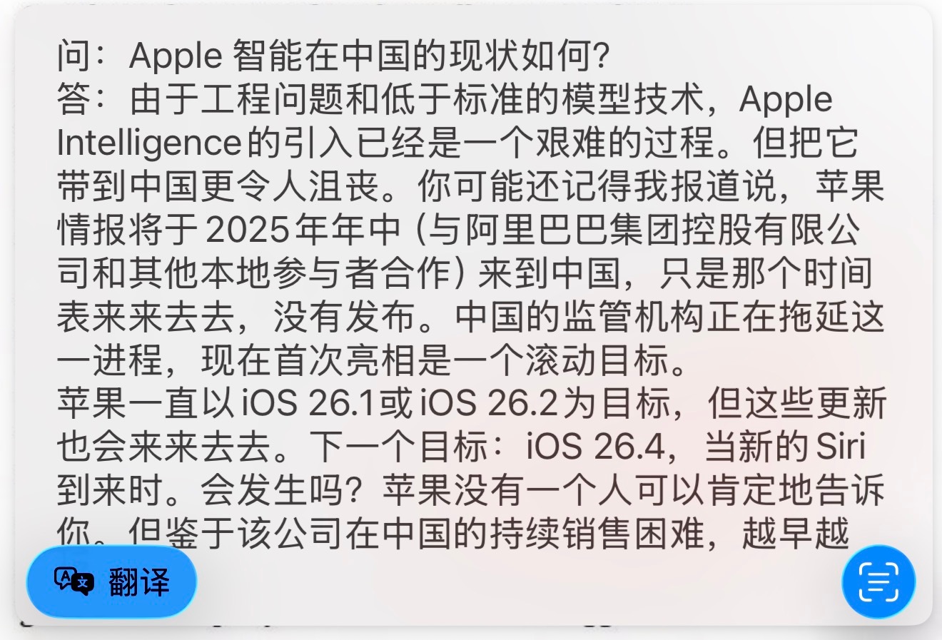 据说,Mark Gurman 在昨天的 Power On 问答中又给出了最新的国行 Apple Intelligence 的上架预估时间:iOS 26.4。(图三为译文)