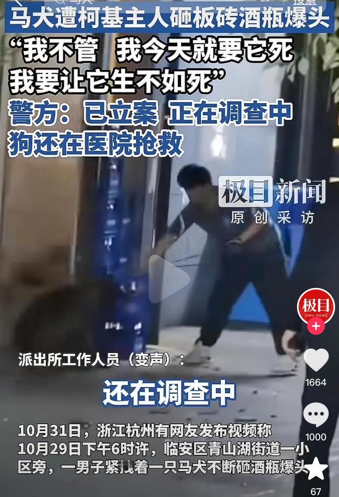 为杭州青山湖马犬(管家)发声!严惩施暴者! 男子虐狗施暴过程长达20多分钟!!!20多分钟对于这只马犬来说有多漫长,疼痛,恐惧,无法想象!!! 施暴起因——马犬签绳(有狗证),柯基没牵绳(无狗证),柯基去挑衅马犬,耳朵被咬伤,柯基的男女主人(见照片)当街撒谎,谎称他家柯基被咬死了。 施暴过程(时长20多分钟)——柯基男主人开始当街对 马犬施暴虐待泄愤,用十几个啤酒瓶子对着马犬头部、胸部、腹部往死里砸,仍然不解气后采用砖头砸,最后拉着铁链将马犬快速旋转于空中,旁边宠物店的工作人员去拉架也被划伤了,并扬言谁敢拦一起打。 马犬主人不在现场原因——马犬主人女儿发烧,其决定先把孩子送回家,再去医院解决狗狗矛盾问题。 马犬目前情况——仍在医院接受抢救,还没有脱离危险期,全身多处外伤,胸部腿部多处骨折,多个内脏严重受损,其中肺部受损非常严重。 希望大家理性判断,也希望马犬安全度过难关,还马犬一个公道!!!别让合规养犬的人寒心,更别让无辜生命白白受苦。 听说——这个柯基男主人已经不是第一次这么打别人的狗狗了,很多次了,暴力倾向很严重。 杭州马犬发声 青山湖马犬 尊重生命善待动物 杭州青山湖 动物保护法发声