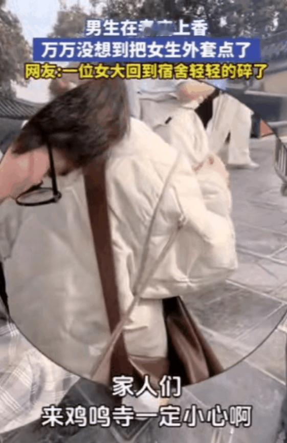 这就是缘分!江苏一男生去寺庙上香,想求一份姻缘,万万没想到,刚把香点燃,就把旁边女生的外套戳了一个洞!女生一回头,男生尴尬得不停道歉,女生大人有大量没有计较,网友:一位女大回到宿舍轻轻的碎了! 江苏南京的鸡鸣寺里,周末的游客比往常多些,大家都知道这里求姻缘比较灵验,想要碰到属于自己的一份缘分,   有个男生挤在人群里,手里攥着三炷刚点燃的香,烟丝袅袅往上飘的时候,他低着头默念,认真求姻缘,眉眼间都带着对未来的期待。   他祈愿完,按照规矩俯身参拜,手往下落再抬起来的瞬间,没注意到身前有个穿白色羽绒服。   燃着的香头就这样蹭在了女生的外套后肩上,火星子一下就烫出个小洞,黑焦的边缘还沾着几根羽绒,风一吹,细烟就散了。   男生的手一下僵在半空,抬头看见那个洞,脸“腾”地就红到了耳尖。   他慌忙把香往旁边挪,嘴张了又合,只挤出几句结结巴巴的道歉,说自己不是故意的,声音里全是慌神。   女生听见动静回头,先是愣了一下,盯着衣服上的洞皱了皱眉,可看到男生那副又愧疚又紧张的样子,只是伸手拍了拍外套上的灰,转身继续去拜自己的了。   旁边有人把这一幕拍了下来,视频发到网上,很快就有了不少评论。   大家看了都觉得可惜,说这男生是“给机会都不会抓”。   有人说,女生没计较就是最好的信号,哪怕当时稳住神,说句“加个微信吧,我赔你件新的”,后续说不定就能慢慢聊起来。   还有人调侃,这哪是闯祸,明明是月老特意递过来的牵线绳,结果男生光顾着道歉,把绳子给弄丢了。   生活里像这样的情况不少见,很多人盼着缘分降临,可真当机会摆在面前,要么像这个男生一样慌了神,要么不好意思主动,最后只能看着缘分溜走。   就像这次寺庙里的意外,一炷香的火星让两个陌生人有了交集,女生的宽容已经递出了台阶,只要男生多一点主动,这段交集或许就能延续。   可他只停留在道歉的环节,没想着抓住这份突如其来的缘分,也难怪网友会觉得惋惜。   有人说 “有缘千里来相会”,可缘分从来不是光靠等就能留住的。   有时候是一次偶然的碰面,有时候是一场小小的意外,这些看似不经意的瞬间,可能都是缘分的信号。   关键在于能不能及时反应过来,敢不敢主动迈出一步。   就像这次寺庙里的男生,如果他能鼓起勇气开口要个联系方式,哪怕只是说后续赔偿的事,也不会让这段缘分只停留在 “烫坏一件外套” 的小插曲上。   不知道你有没有过类似的经历?   可能是在某个场合遇到过让你心动的人,却因为没敢主动说话而错过,也可能是抓住了一次偶然的机会,最后收获了意想不到的缘分。   如果你愿意,不妨分享一下自己抓住或错过缘分的故事,或许能给更多人一点启发,下次再遇到缘分信号时,能更勇敢地伸出手接住。