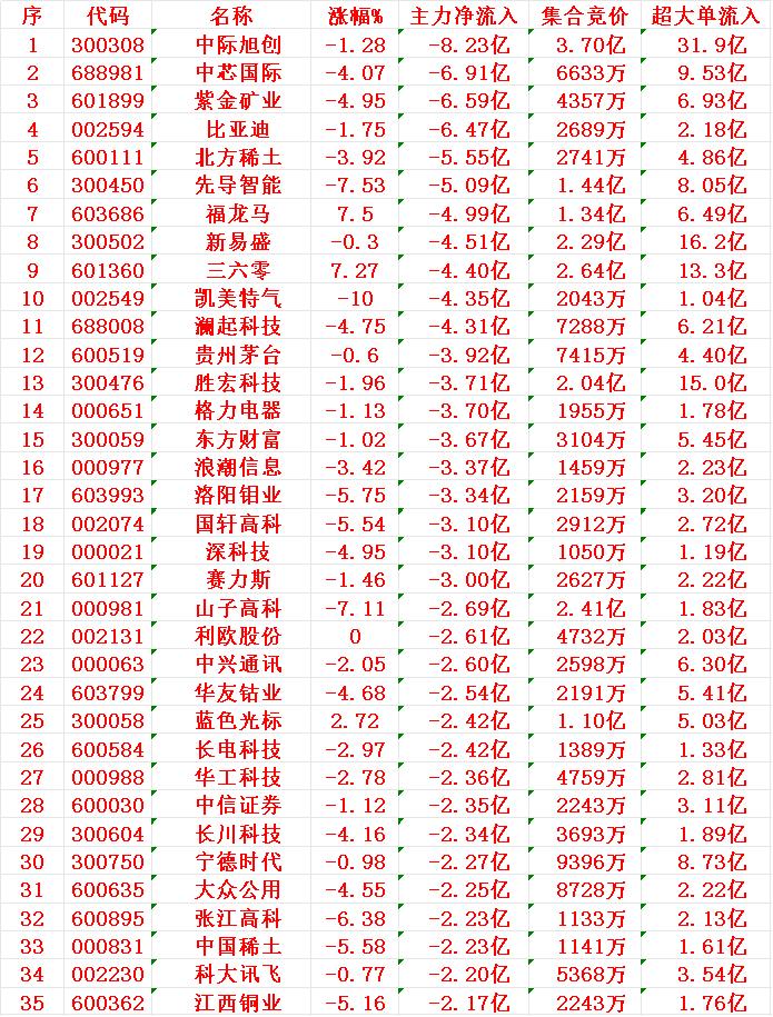 11月3日开盘45分钟,主力资金“卖出的 ”35名单! 中际旭创:净流出 8.23亿元 中芯国际:净流出 6.91亿元 紫金矿业:净流出 6.59亿元 比亚迪:净流出 6.47亿元 北方稀土:净流出 5.55亿元