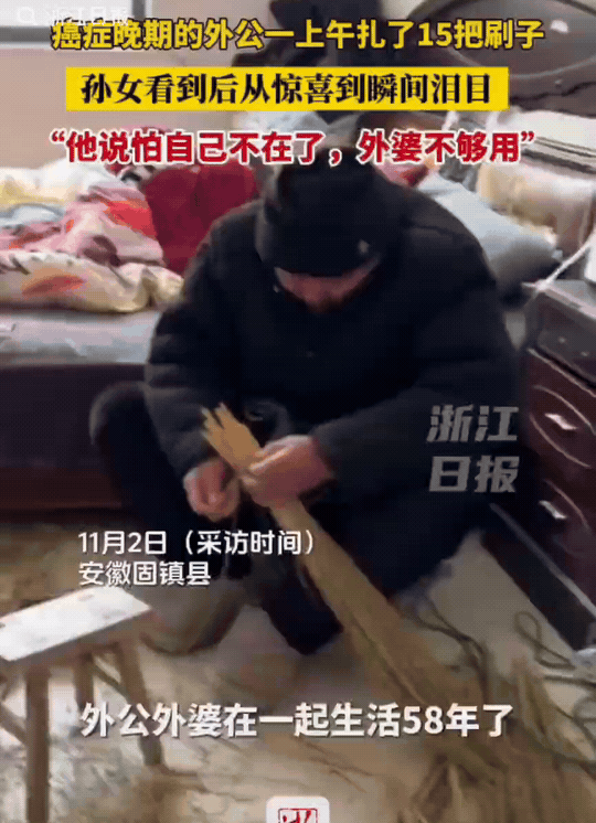 泪目! 安徽,朱女士回到家,看到ai症晚期的外公在做刷子,一上午就做好了15把。外公说:“怕他走后,外婆不会做,多做些,留给外婆以后用。” 朱女士下班回到家,看到外公在做刷子。她感到很高兴,外公已经病了4年了,经常躺在床上。看到他能有力气做着事情,朱女士很高兴。 他问外公为什么做这么多刷子啊?外公说,他怕自己不在了,外婆不会做,所以多做些,留给外婆以后用。听到外公这么说,朱女士瞬间感到很难受。 她外公外婆已经一起生活58年了。外公已经病了4年了,外公坦然接受自己的病情,每天就是和老伴一起开开心心的过日子。 这就是夫妻,这就是相濡以沫。老爷爷和老奶奶让我们看到了夫妻该有的样子。就像结婚誓言说的一样,无论顺境还是逆境,无论富有还是贫穷,无论健康还是疾病,我们都风雨同舟,患难与共,同甘共苦,成为终生的伴侣!