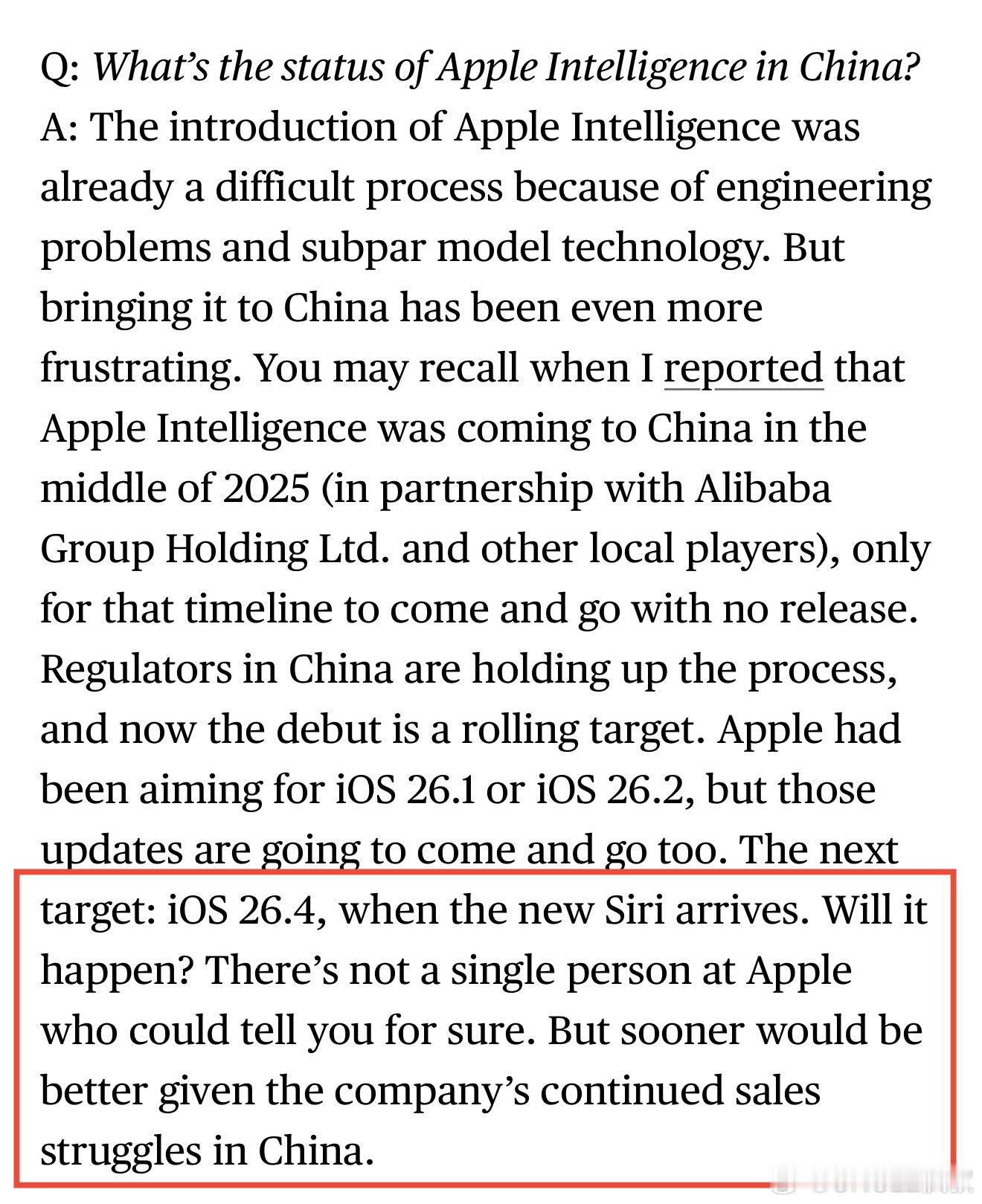 彭博:预计苹果将在iOS 26.4版本中为所有中国用户推送Apple Intelligence.