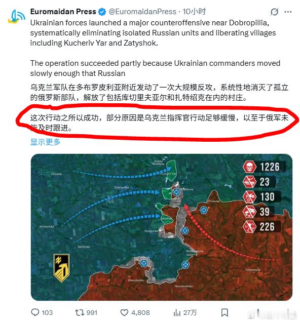 这次行动之所以成功,部分原因是乌克兰指挥官行动缓慢,导致俄罗斯军官不断向上级发送虚假报告,声称阵地保持稳定。
