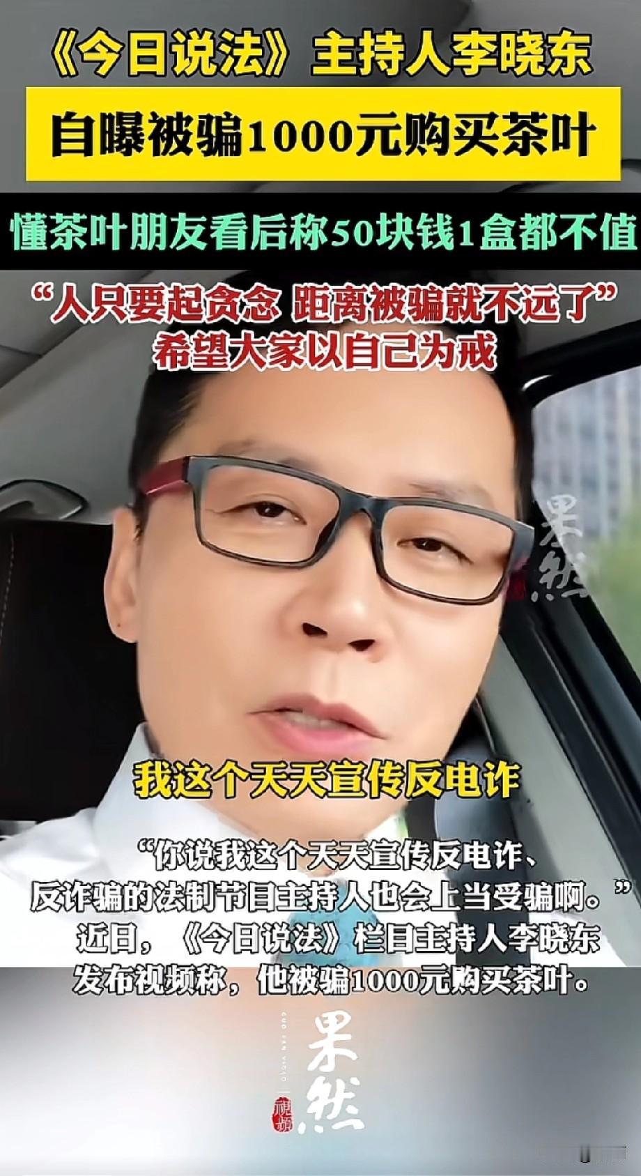 《今日说法》主持人李晓东11月1日发视频自曝被骗。他去银行办事后,遇一中年人开奔驰推销茶叶,称展会结束带不走,原价1000元的铁观音降到200元一盒,他花1000元买了5盒。结果懂茶的朋友说,这些是添了香精的伪劣茶叶,50元一盒都不值。 天天宣传反诈骗的主持人也中招,可见骗局不分人。骗子就抓着大家贪便宜的心理,用豪车和低价当诱饵。这种展会尾货骗局早就在成都、浙江等地出现过。 李晓东说人只要起贪念,距离被骗就不远了,这话太实在。不管对方包装得多像回事,遇到天降“实惠”都得绷着根弦,别让小贪心吃了大亏。