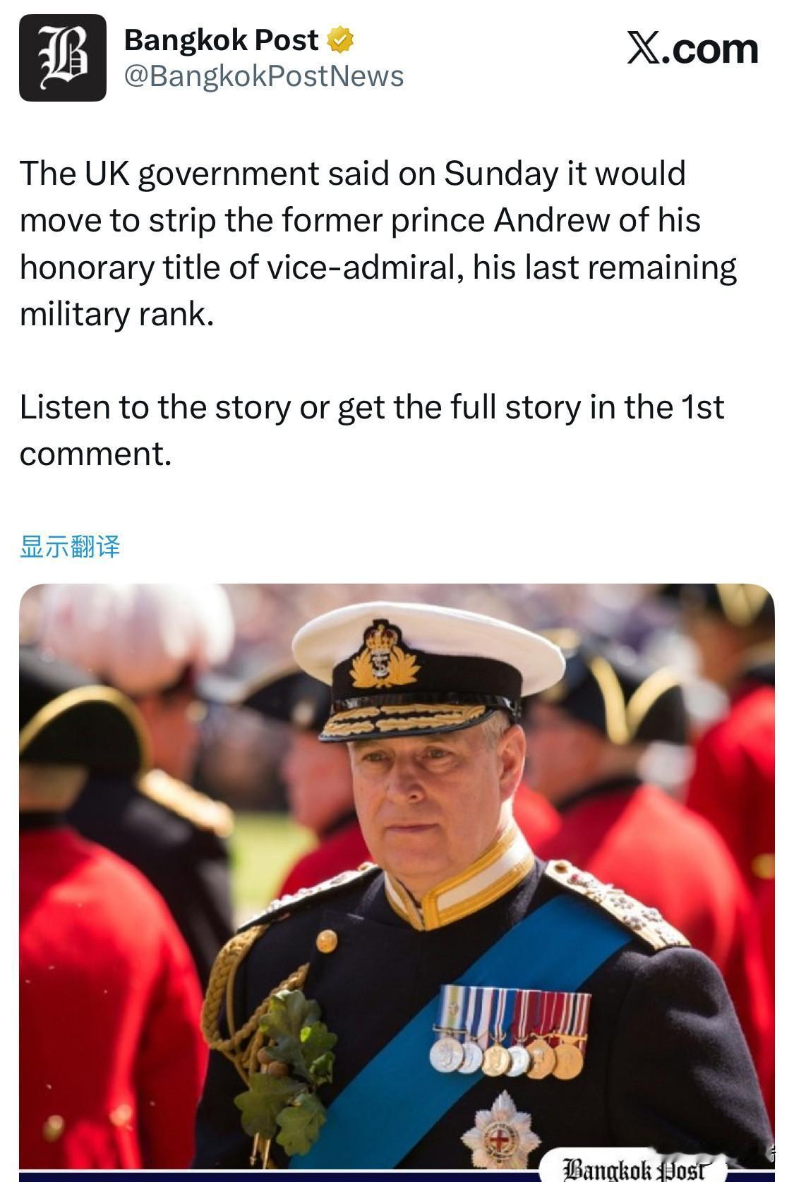 英国政府周日表示,将剥夺前安德鲁王子海军中将的荣誉头衔,这是他仅存的军衔。