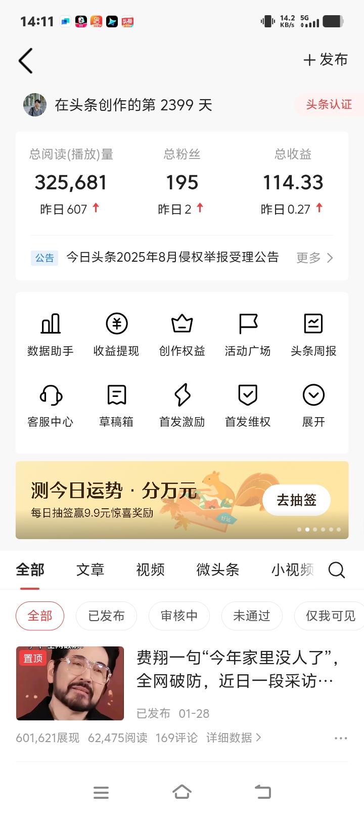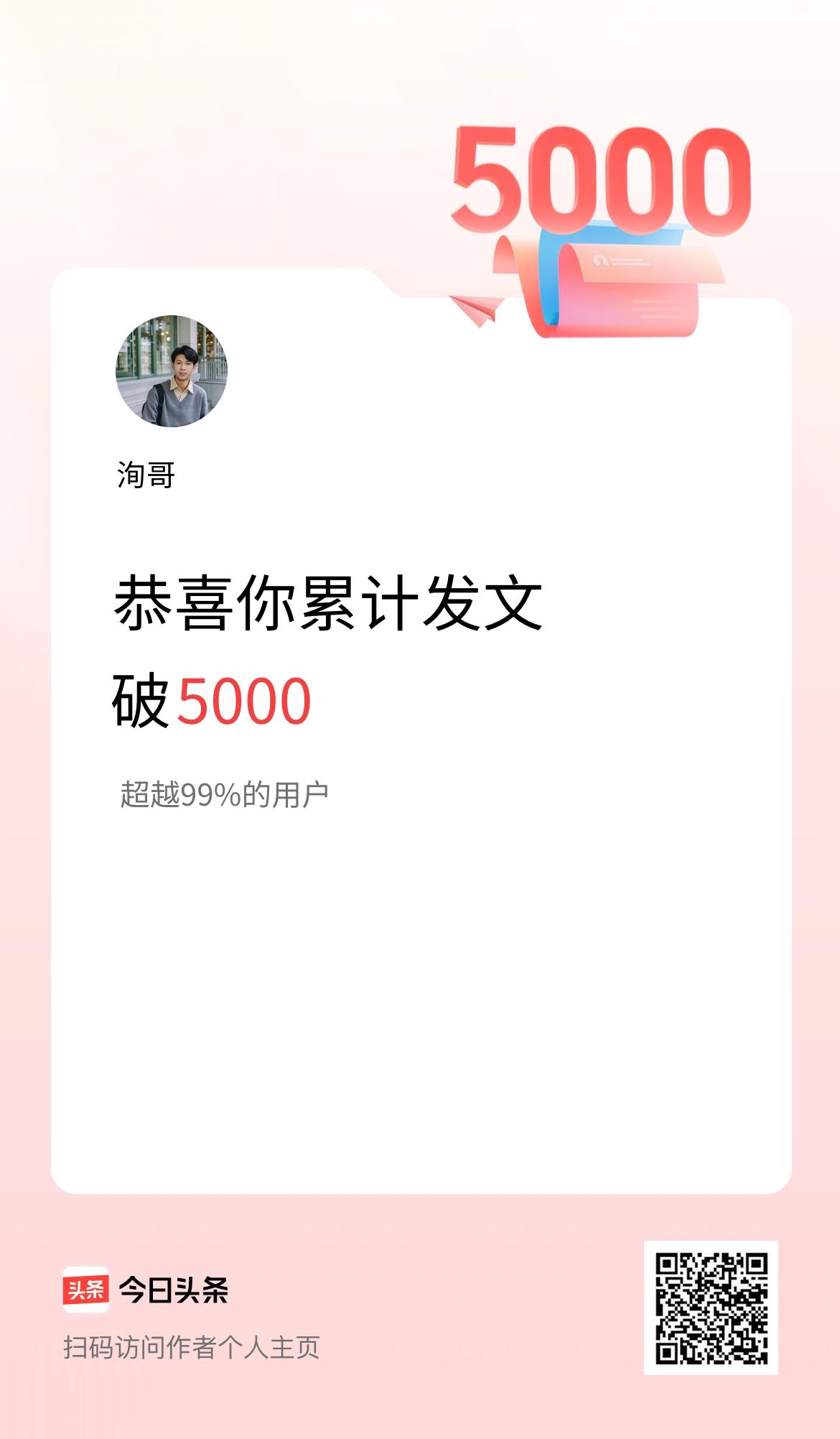 剛點開今日头条极速版洵哥主頁看到,洵哥是該感到髙興呢還是感到髙興……[捂脸][捂脸][捂脸][笑哭][笑哭][笑哭][祈祷][祈祷][祈祷] 從2025年1月25日用Ai創作及加上自个的修改發佈第一篇文章起競然至今天2025年11月3號14:30分這个點了已突破5000篇文章了,一篇就按最少800个字算,嫩快算算洵哥已創作寫了多少个字了?400W+的字了,這九个多月從2月24號第一次违规到現在已違規2次了,一次比一次嚴重,真爬不起來了,洵哥这近十个月木黑木白的寫了400w+字九个多月只才掙到114.33元一0.06元(寫文章前約六年得的)=114.27元,400多萬字的文章才掙114.27元,洵哥是真服了今日头条极速版平臺了[捂脸][害羞][祈祷] 恭喜妳累积發文破5000 洵哥 Ai寫作