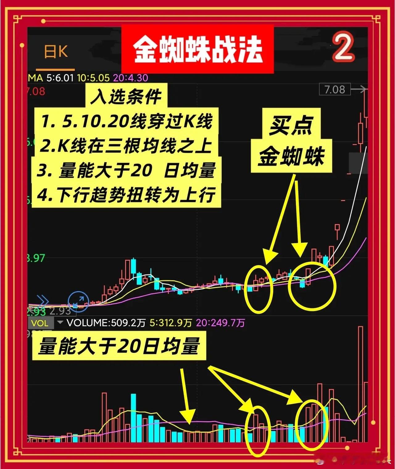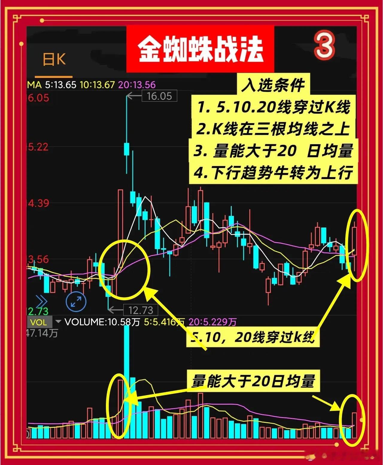 “金蜘蛛”战法三线同穿K线实体,当天放量就是主力点火,错过就要追高。“金蜘蛛”不