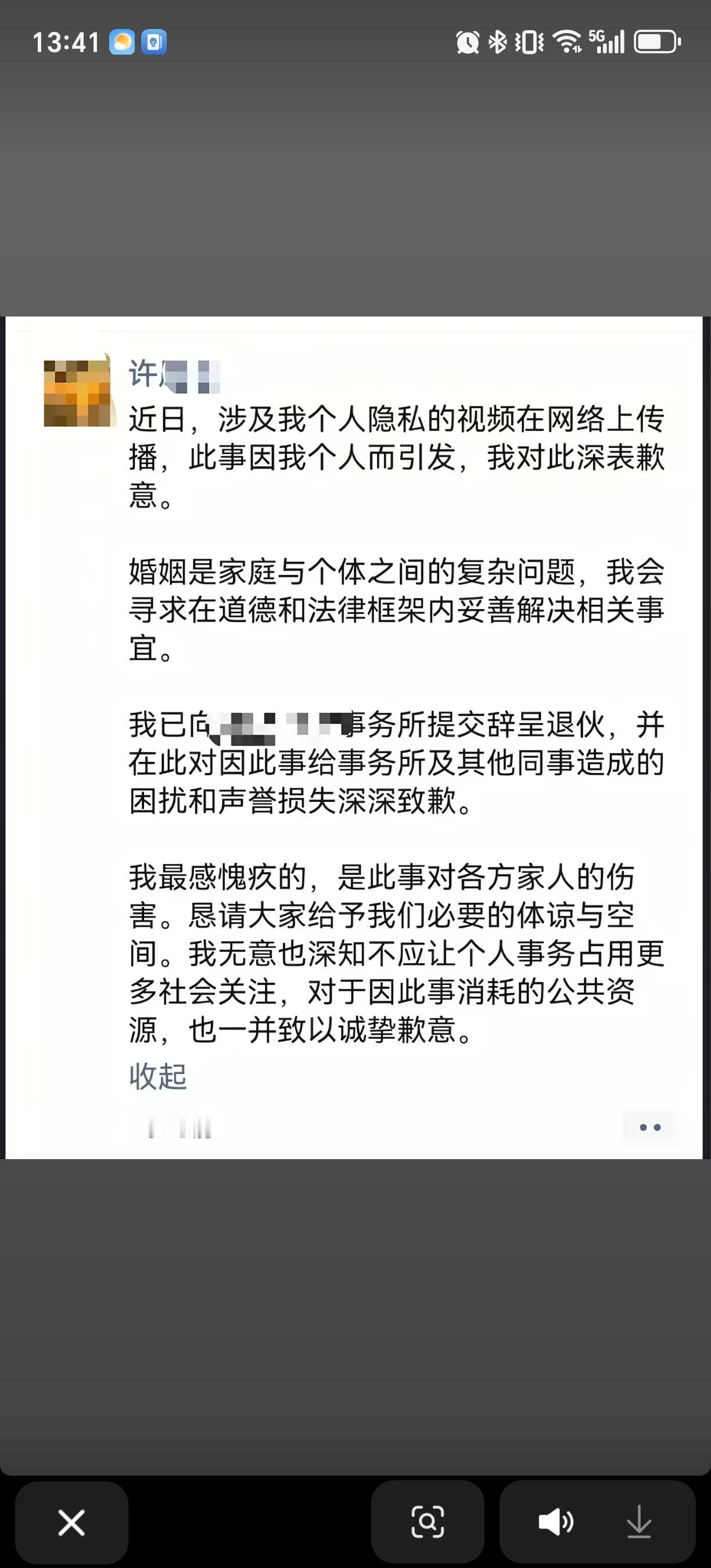 上海小三事件后续来了! 渣男许某已经向某合律师事务所主动递交了辞职信,原配已经赢得阶段性胜利了 大家看完来评评理 许某说这事是个人原因所致,会在道德和法律之间寻找应对方法,因为这事让公司名声受损,他很抱歉,让家人受到影响他很抱歉,唯独没有对妻子的抱歉,为什么不讲这事对妻子的伤害? 并且字字不提自己的错误,巧舌如簧,避重就轻他的那点聪明才智用在出轨上,道歉信非常的官方,不愧曾经是律师! 现在就看三姐那边了,这个男心理强大,也不会有是非观,估计后路早就铺好了,目前除了让他丢了事业,还能干嘛呢?