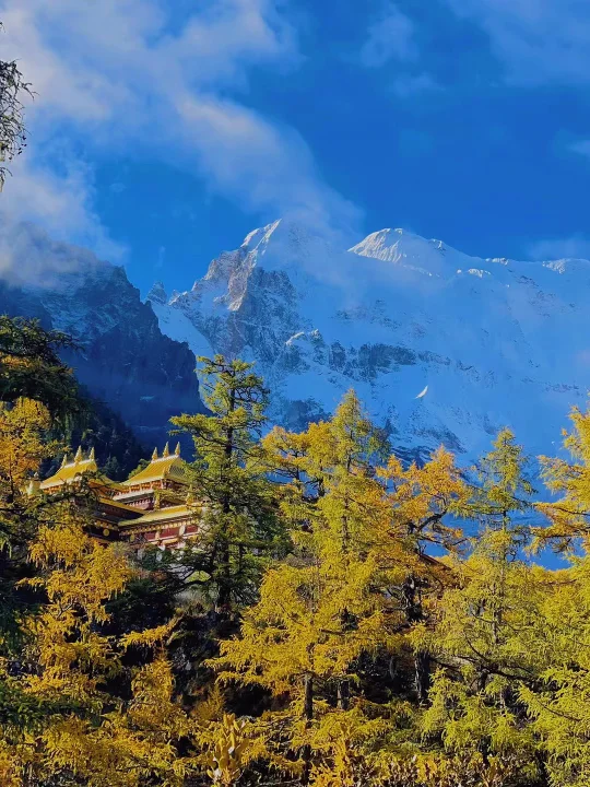 1️⃣冲古寺:这里可以看到仙乃日雪山,还可以拍到和雪山的合影,以及深秋五颜六色的彩林
