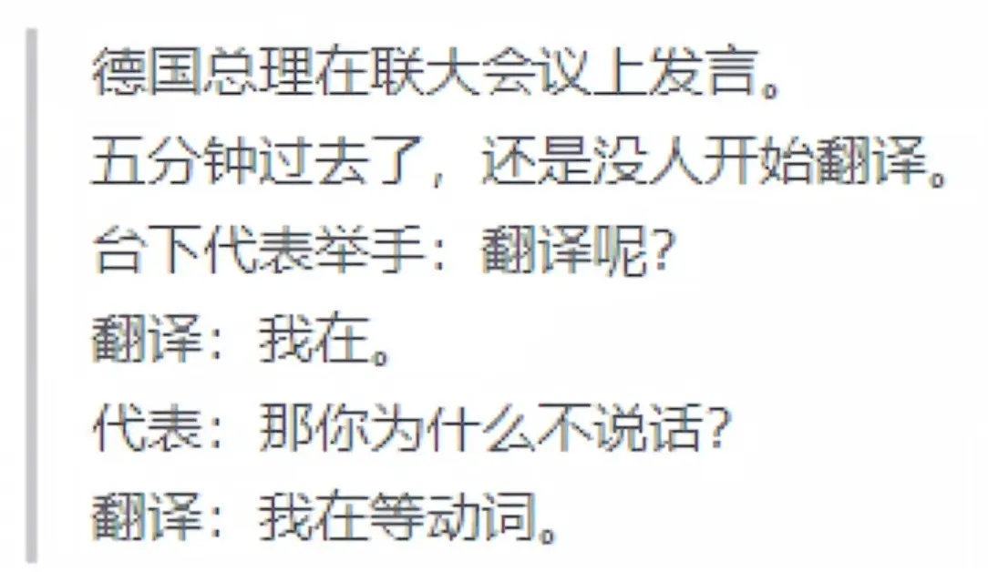 不同语言的翻译梗太绝了!德语翻译“我在等动词”,日语翻译“我必须等他说完”,中文翻译“对方向你分享了一个压缩包”。专业翻译是可以灵活处理的哦~你遇到过哪些搞笑的翻译翻车现场? ​​​