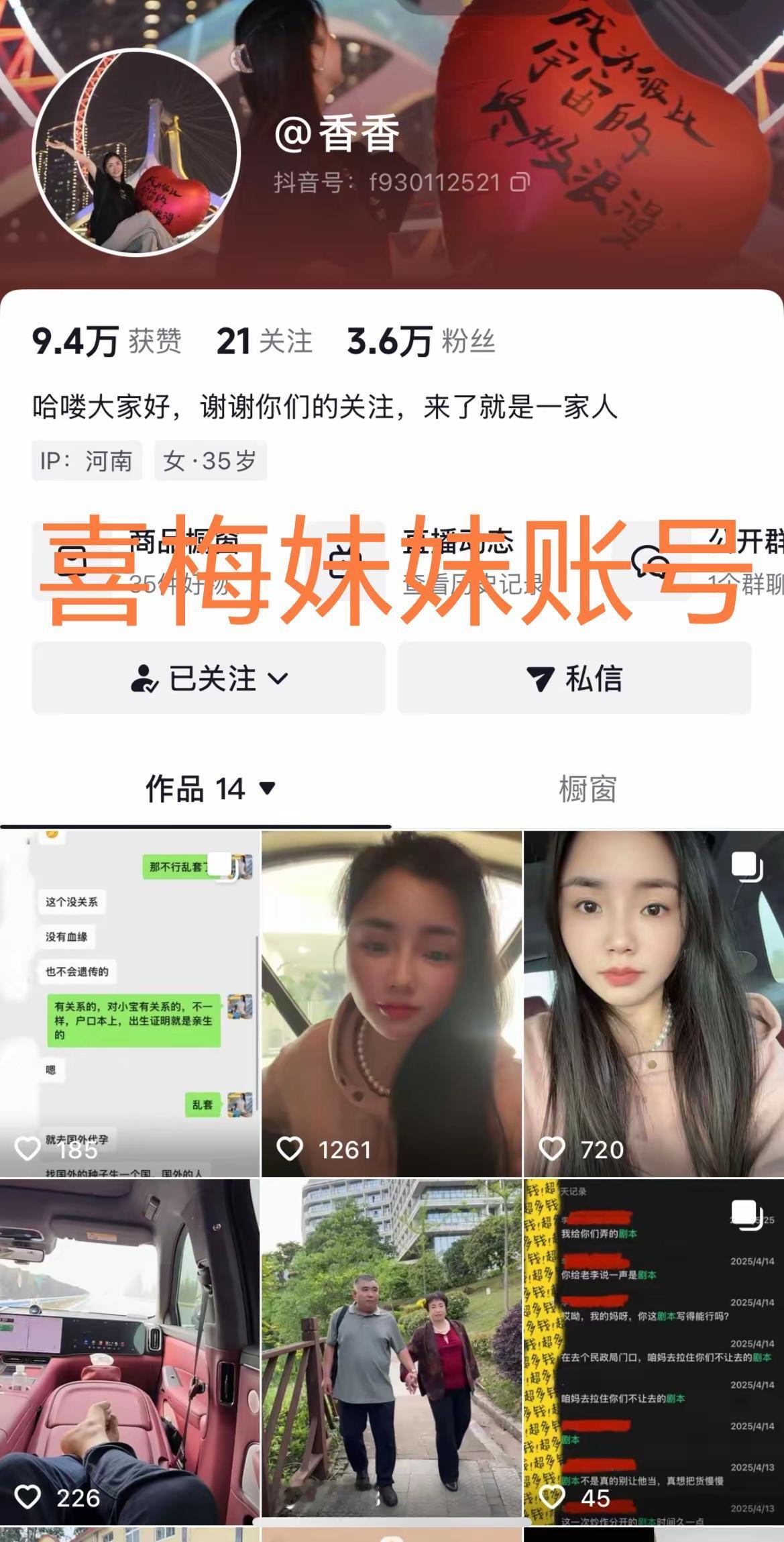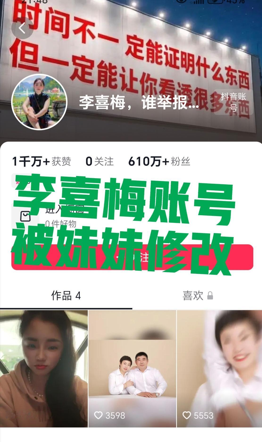李喜梅600万大账号的账号名变成:李喜梅,谁举报我,谁是狗?? [我想静静]原来是喜梅的妹妹香香改的。 李喜梅做自媒体,是她的号,但她用妹妹的实名去认证的,这是一开始就说好的,就和香香这个妹妹没有关系。 本来妹妹也有一个小账号, 和喜梅闹矛盾以后,妹妹强制盗用了李喜梅的大账号,600万那个账号里喜梅的视频被删得一干两净。 但喜梅现在麻烦了,账号被妹妹修改了。只能用大双的号了! 但喜梅报警了,里面还有20万的钱未取出,另外大账号的归属引争议! 喜梅妹妹香香也请了律师对应网暴。 这一家子,是是非非也是不停过! 还是因为喜梅有钱有老公,爱老公,信老公,疼老公, 娘家人也看不惯喜梅的作风! 家家有本难念的经! 李喜梅 轮椅李喜梅 轮椅女孩李喜梅 电商女王喜梅