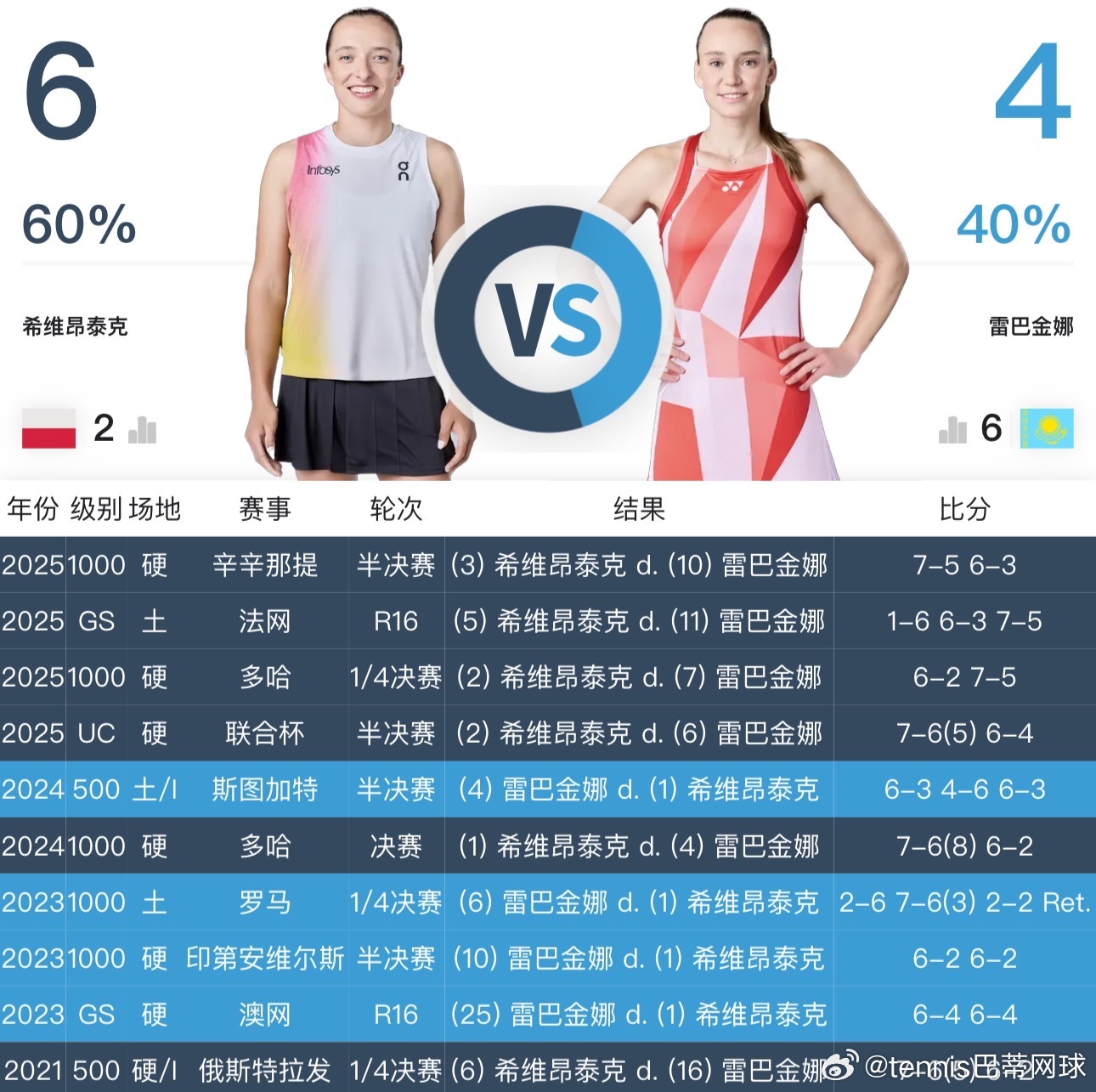 斯瓦泰克今年已经对莱巴金娜取得了四连胜了,最近莱巴状态不错,不知道今晚能否一战?