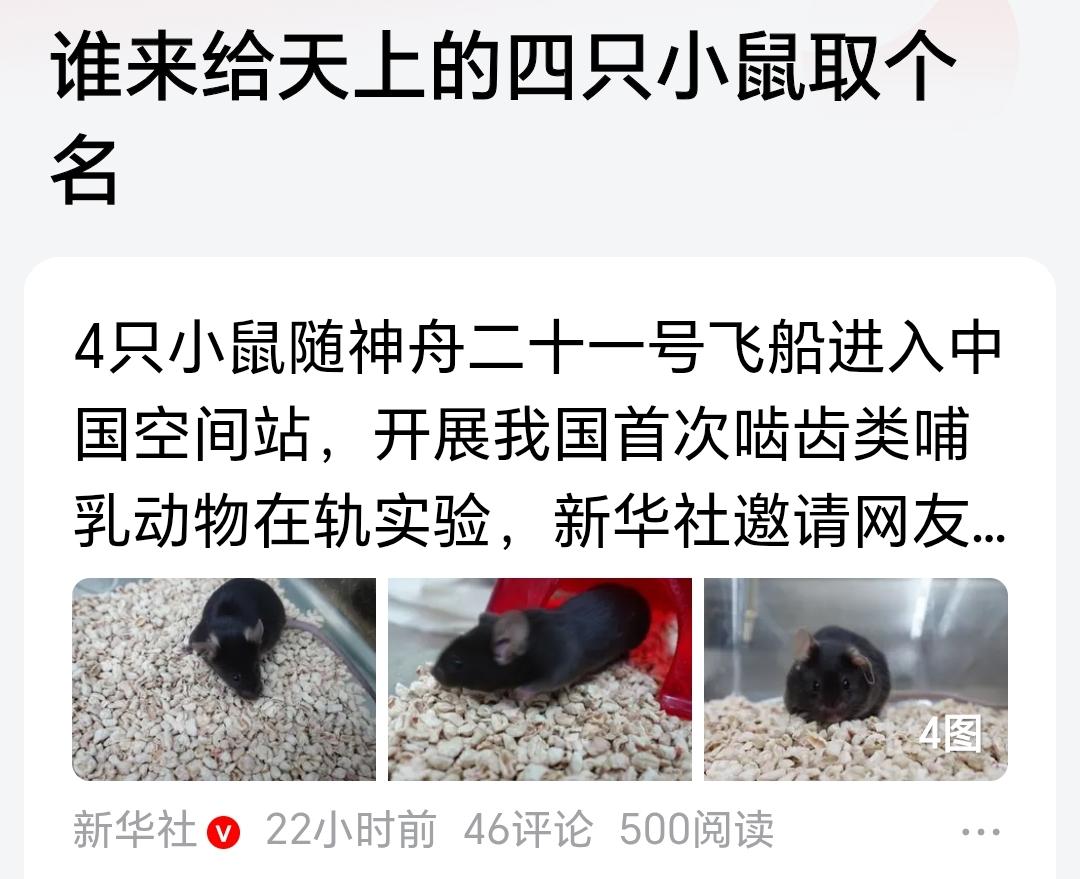 我来![笑哭]两个方向: 方向1,主要体现俺们家太空能力厉害,所以取名:🐭鼠你强、🐭鼠你狠、🐭鼠你行、🐭鼠你厉害 方向2,这四位小同学这次太空旅行也算是上天去取经了。所以是新时代取经四人组:唐小藏、孙小空、猪小戒、沙小僧。这样命名没毛病吧?[笑哭][笑哭][笑哭] 点右上角关注我,我们一起去看这个魔幻的世界