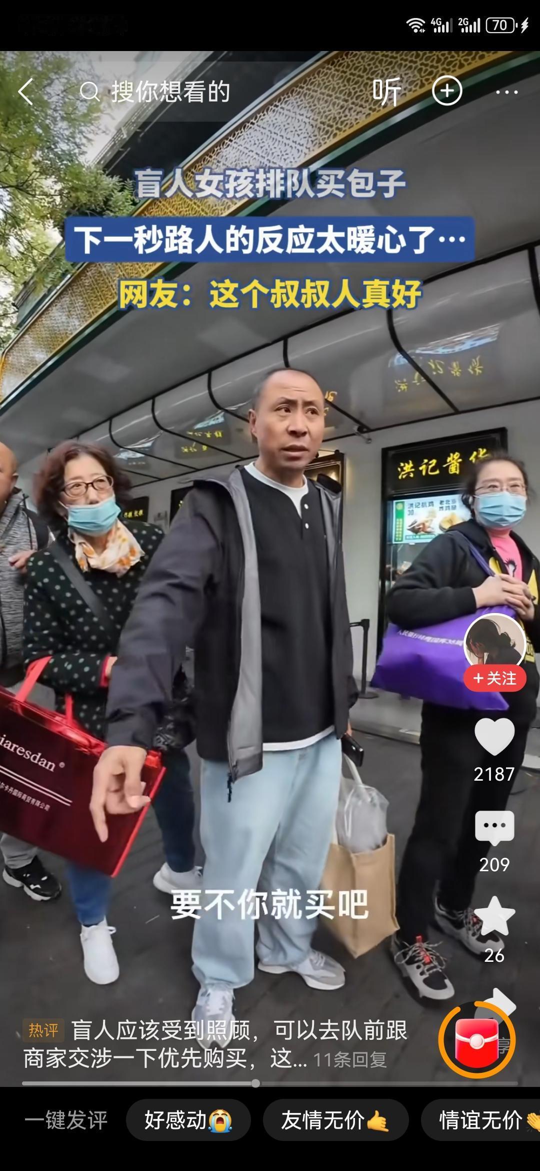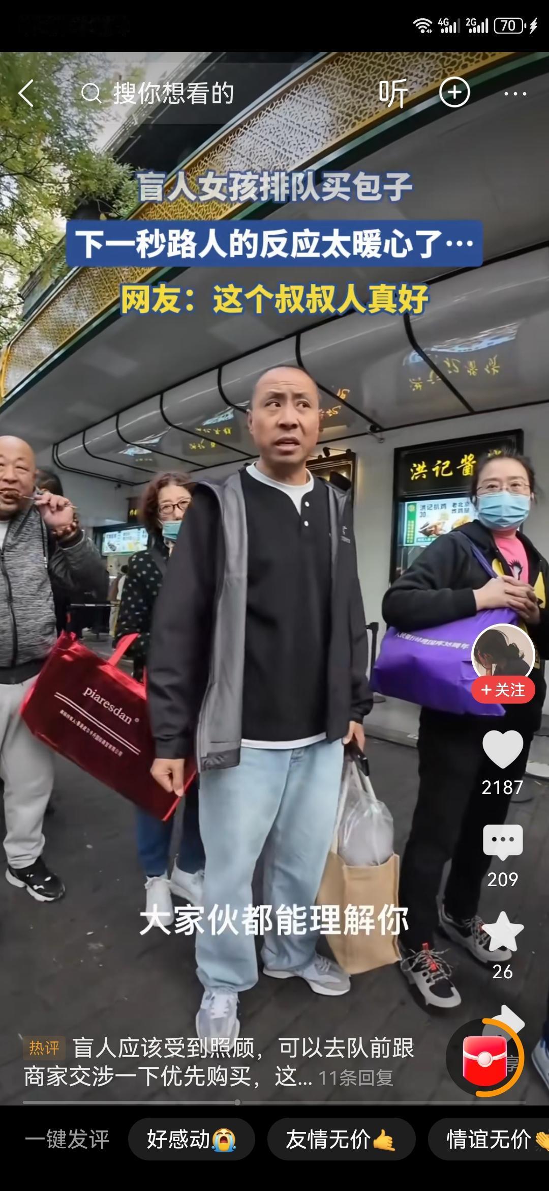 盲人女孩买包子,找队尾排队,大叔直接让她站自己前边,女孩觉得不合适,大叔说,没事儿,你就站过来,大家都能理解你。后边排队的人也说,没事儿,没事儿,直接过去买就行。女孩很感谢大家的包容。其实我们社会的方方面面对残疾人都是很友好的,能帮助就帮助,能优待就优待。残疾人自己也不娇气,怕给别人添麻烦,被帮助了以后也懂得感恩。这才是人与人相处的正确模式。那种仗着自己残疾,对别人颐指气使、谎话连篇的人,不值得同情。 盲人路遇 盲人逛街 盲人摆摊 盲人去医院 盲人拍照 北京盲人阿姨 盲人摊主 盲人买菜 你配同情郑智化吗