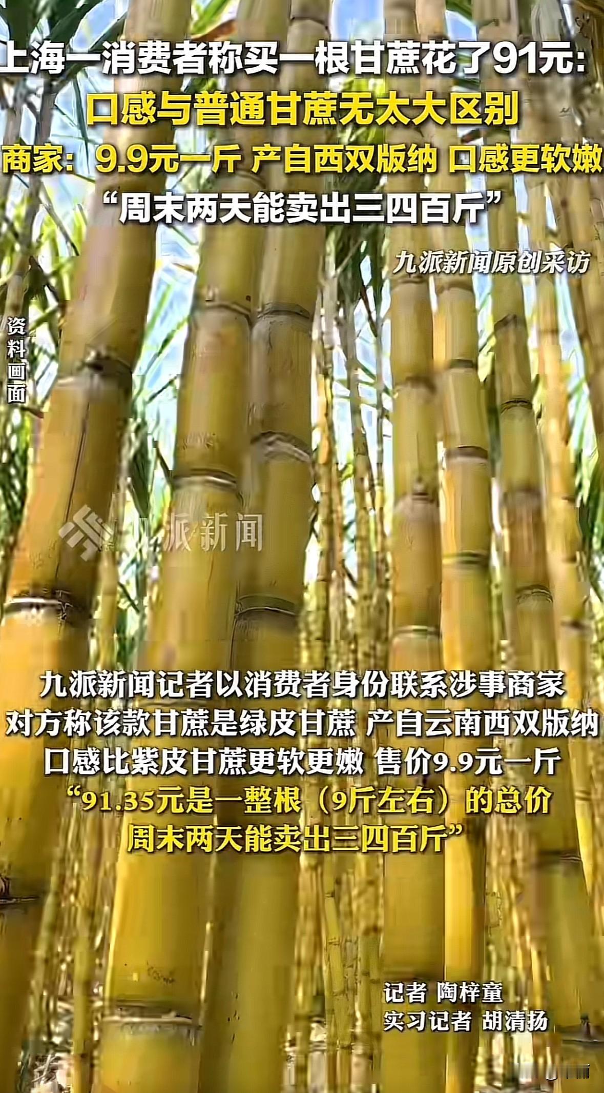 上海消费者买根甘蔗花了91.35元,这事引发全网热议。家里常买整根甘蔗,以前最多花30元,这次孩子在品牌水果店买的,尝着和普通甘蔗没差。 商家说这是云南西双版纳的绿皮甘蔗,9.9元一斤,整根约9斤,口感更软嫩,周末能卖三四百斤。 市场监管说甘蔗非民生必需,价格靠市场调节,但商家得明码标价。 有人觉得这价太离谱,纯属智商税;也有人愿为高品质特色品种买单。 其实高价没问题,关键得物有所值。商家不能只靠概念溢价,得让品质配得上价格。消费者买的时候也得多留意标价,理性选择。你觉得这91元的甘蔗值吗?