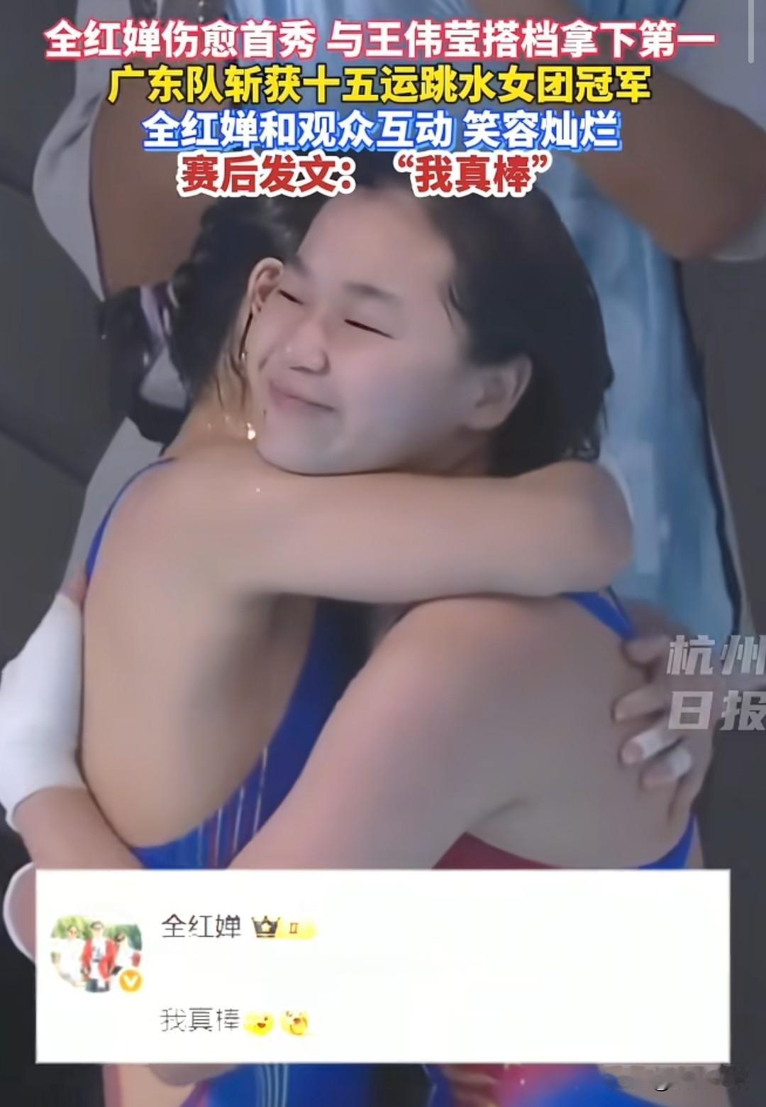 全红禅从来没让我们失望 我们那个放心的全红婵回来了,伤愈复出首秀就拿下十五运首金。 全红婵技术和胖瘦无关,水花依然小,还是之前一样出色,看婵宝的跳水就是一种享受、丝滑流畅极致的美感。 十八岁的全红婵用一百八十三天的蛰服和一场完美的首秀,告诉我们真正的靠谱,是不管顺境逆境都能守住自己的节奏,用行动回应所有的期待。 接下来的双人项目,我们依然相信她会带着这份韧劲清醒和纯粹给我们带来最真实的精彩。 全红婵即使拿不了冠军,我们也支持她,喜欢她,爱她。