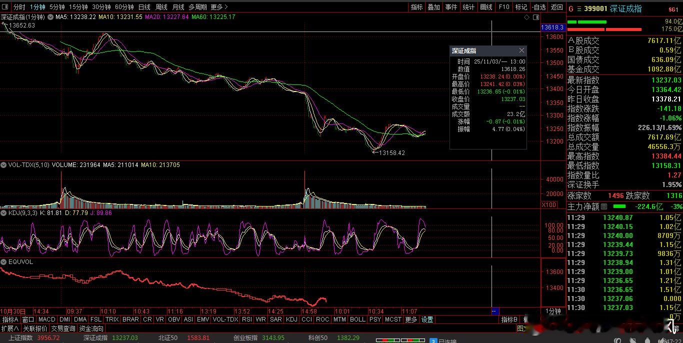 沪深北市:多空遭遇。2677股票上涨,65涨停板。2594股票下跌,11股跌停板。沪深北市:合计成交:13987亿元。午盘视野:沪深低开反弹夭折,尾盘触底缓慢盘升。