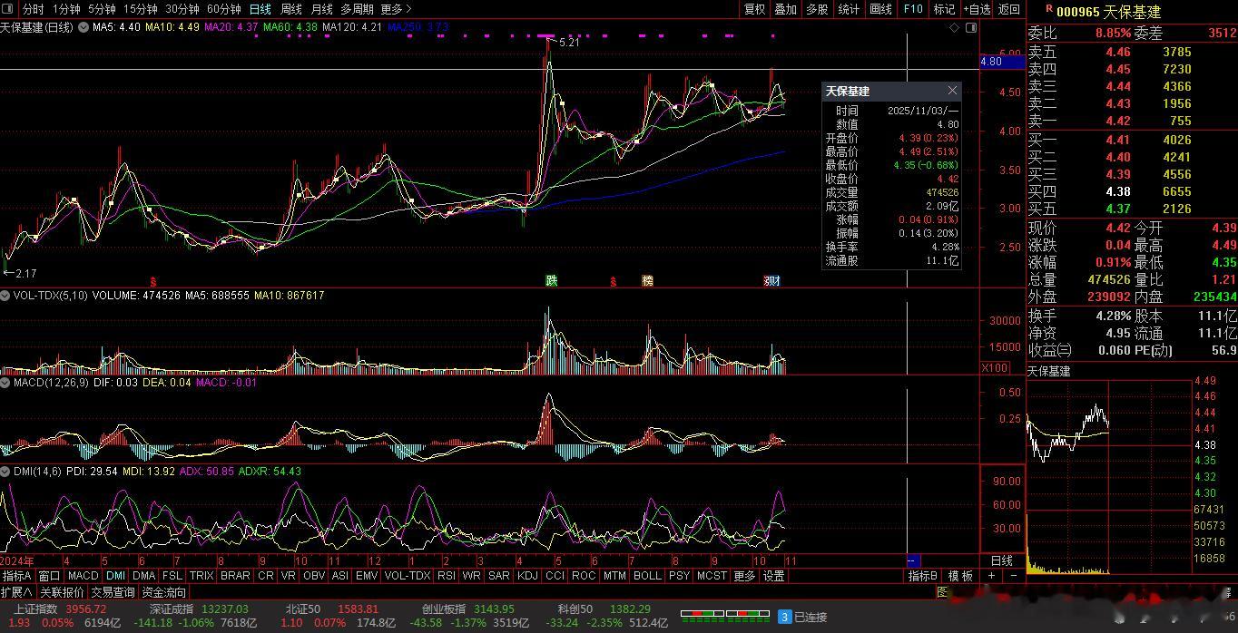 视野盘面:前期双头:触底脉冲。2025-11-03 截至11:30:股价报收:4.42元。该股上涨:0.91%。成交总量:474526手,成交金额:2.09亿元。总换手率4.28%,观总市值:49.05亿元。流通市值:49.05亿元。