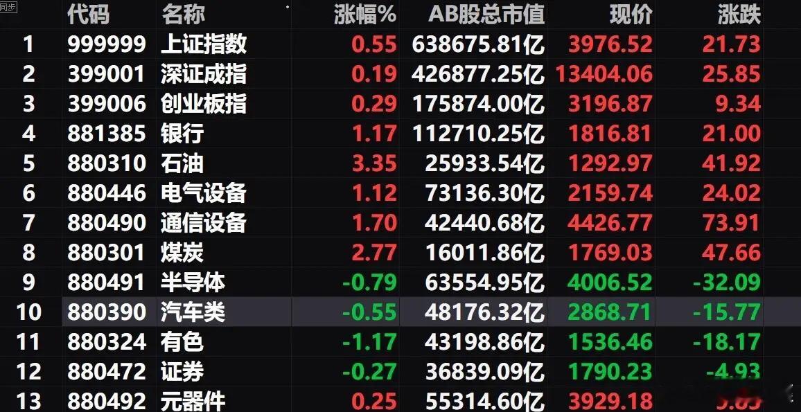二、今天银行、电气设备、石油、通信设备等四大板块是推动A股走高的主力军,而且银行及石油板块基本仅与沪指相关,这是沪指涨幅强于深成指的根本原因。当然今天煤炭板块涨幅达到2.77%,但煤炭板块的市值偏低,其对A股走势的影响基本可以忽略不计。