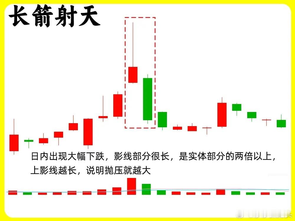 这种走势比较常见, 股价经过长期上涨以后,在高位出现。股价继续上涨,遇到上方的抛压以后,股价在日内出现大幅下跌,影线部分很长,是实体部分的两倍以上,上影线越长,说明抛压就越大,这种形态,我们需要和仙人指路区分开, 长长箭射天形态是在高位出货,而仙人指路往往是股价低位或是上涨趋势的初期,是主力的试盘动作。逻辑是不同的