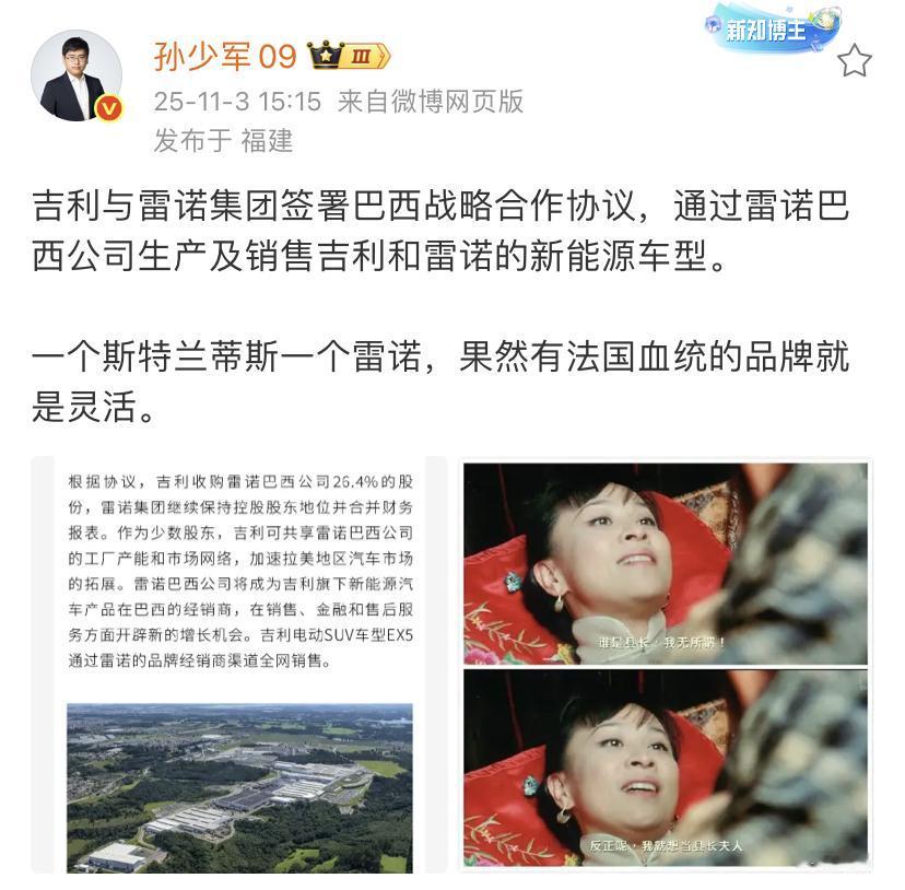 孙少军:吉利与雷诺集团签署巴西战略合作协议,通过雷诺巴西公司生产及销售吉利和雷诺的新能源车型。 一个斯特兰蒂斯一个雷诺,果然有法国血统的品牌就是灵活! 看来这一次采用的方法又是吉利负责给车型,然后换标成雷诺的车型在当地售卖,此前在韩国市场上星越L就换标了。 雷诺韩国的大科雷傲(그랑 콜레오스),它其实是吉利星越L的换壳,除了改个前脸和车标,几乎啥也没动。 现在吉利准备将这种资源给复制到巴西去,各位是怎么看的?欢迎评论区留言。