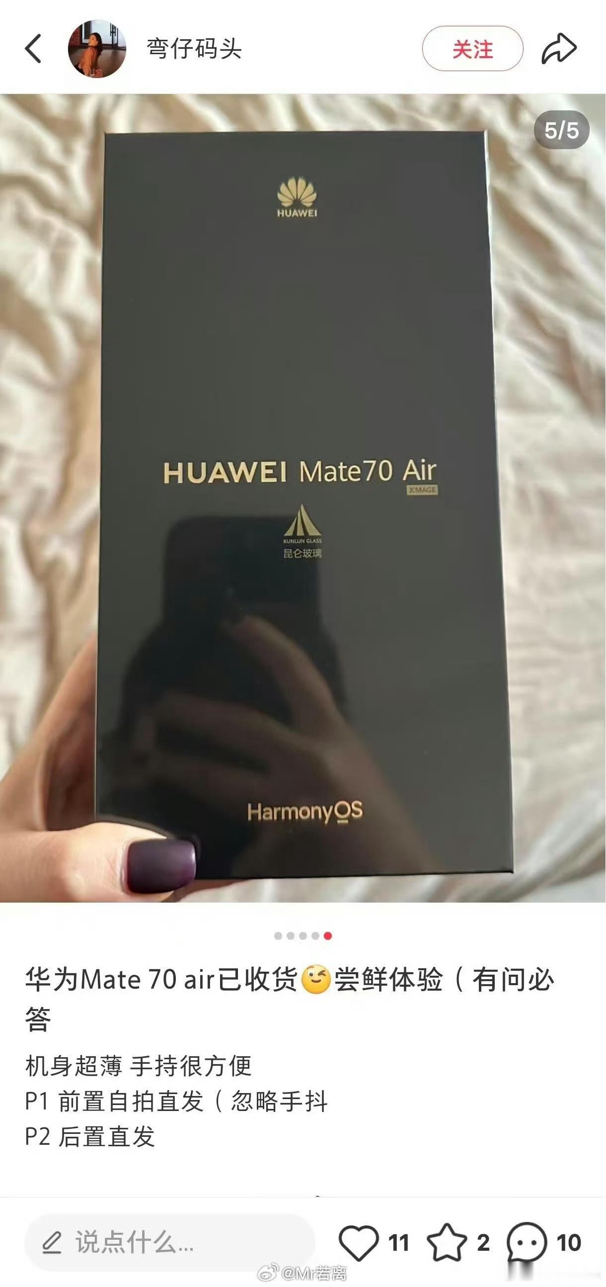 华为mate70air真机曝光 某书疑似直接公布了华为Mate70Air真机,不知道真假,但是这胆量没的说,但是就看这个图片该机延续了家族一贯的设计风格,采用宽比例屏幕,配备等深四曲屏,前摄为单独开孔形态。