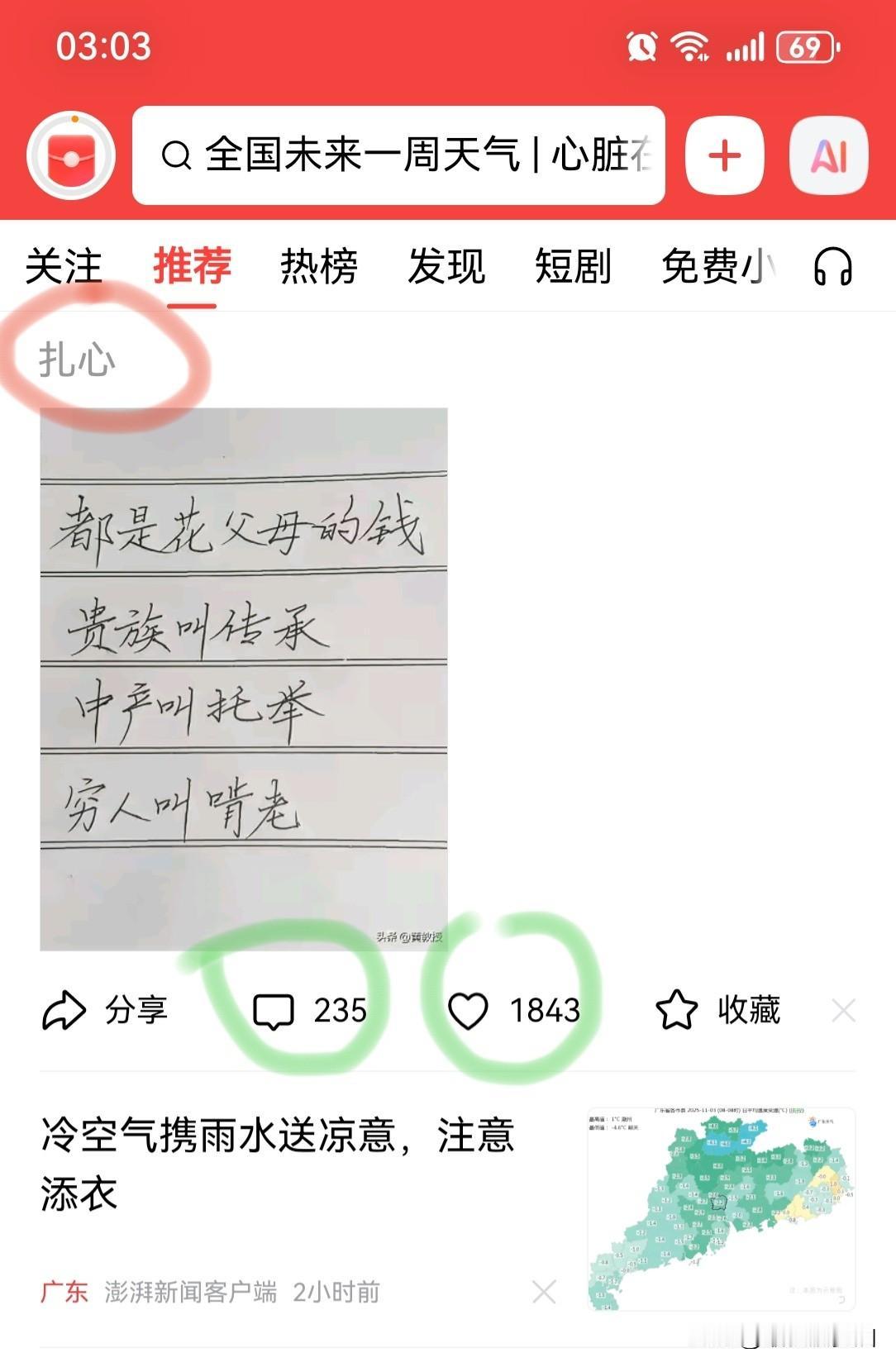 今天在头条推荐页面刷到一位397万大咖的作品, 一张图片+简短的两个字——“扎心”! 居然获得77.6万展现量, 1843个赞, 评论235, 至于阅读量多少就不知道了, 相信应该也不会太低。 大咖就是不一样啊! 本身就是流量! 哪像我们这些普通人, 老老实实地码字, 一篇上千文字的文章, 展现量不过万, 阅读量不过千。 这才是真正的扎心啊! [捂脸][捂脸][捂脸][捂脸][捂脸][捂脸][捂脸][捂脸]
