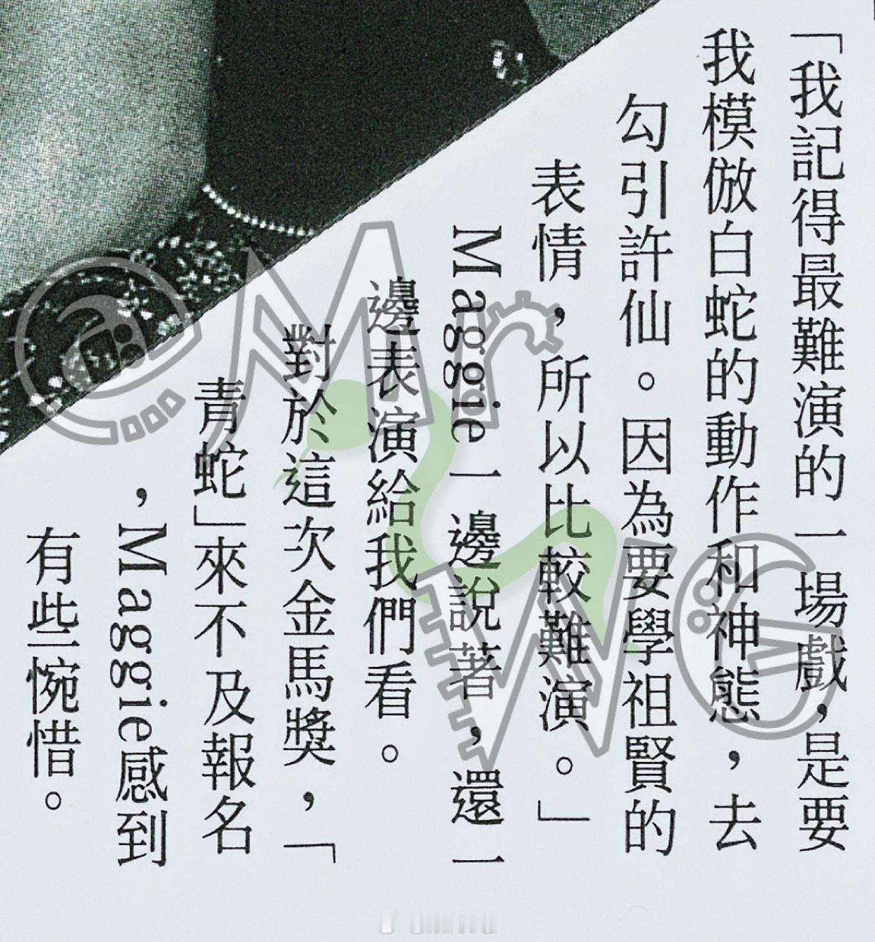 事实是,如P9,93年Maggie宣传本片时,表示很在意徐克对她这次表演的看法,并觉得【青蛇】很值得报Golden Horse Awards,而【青蛇】时间上没来得及参报让张曼玉觉得很遗憾,足见她对【青蛇】的重视与喜爱。💖