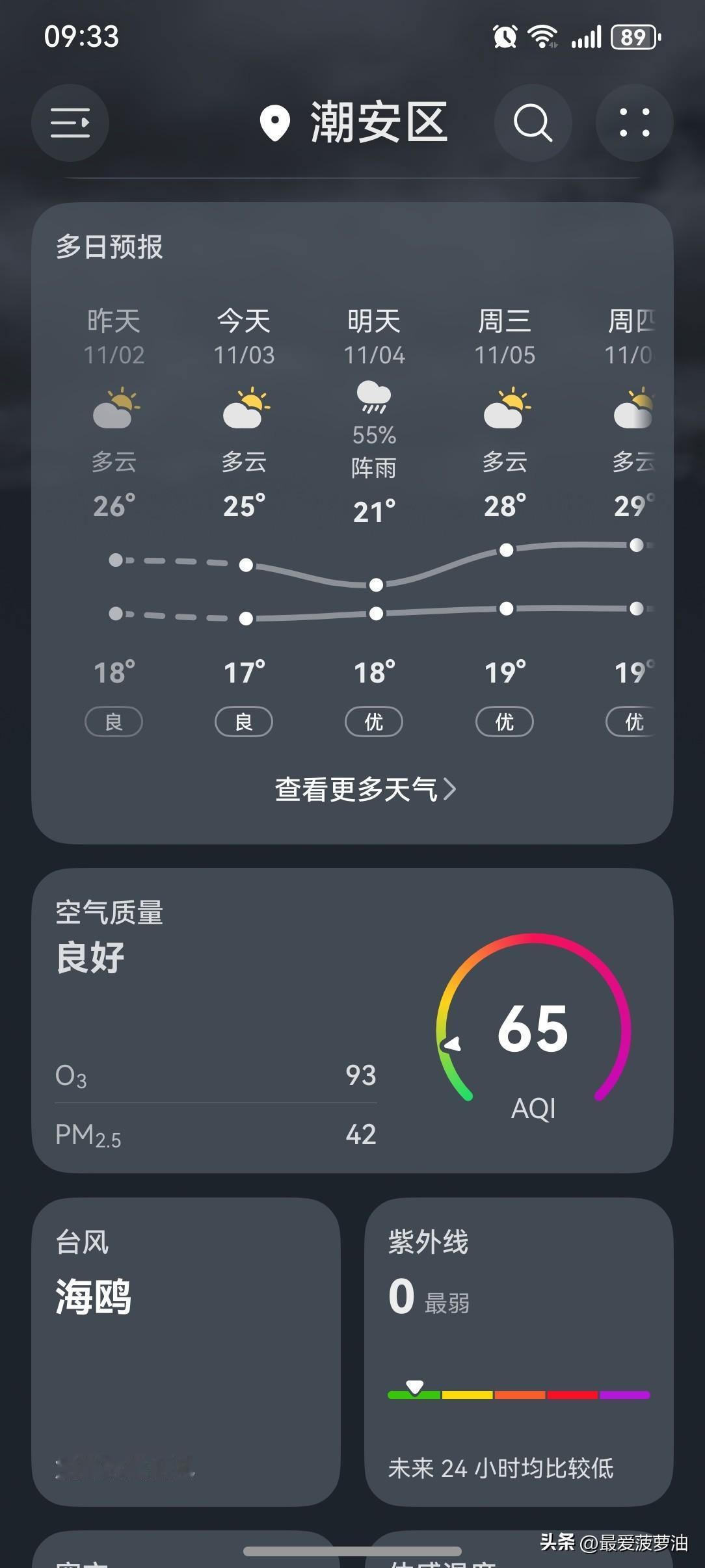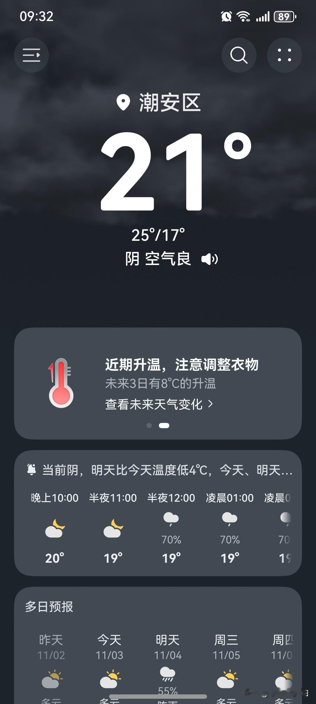 3到4日冷空气携雨影响广东 气温降降降! 4日全省降水逐渐趋于明显, 早晚体感清凉, 注意适时添衣。 今天(3日), 潮州喜提一个多云天气, 气温17~25℃, 此刻气温21℃, 体感温度22℃。 中午出去了一趟, 感觉还是有点热。 不过, 越晚越凉了。 俗话说得好:“一场秋雨一场寒!” 明天将迎来一场降温雨, 体感会更加清凉。 今晚就先把明天要穿的长袖准备好, 省得明天早上措手不及。 弱弱的问一句: 这张秋意清凉体验卡, 你觉得怎么样呢?