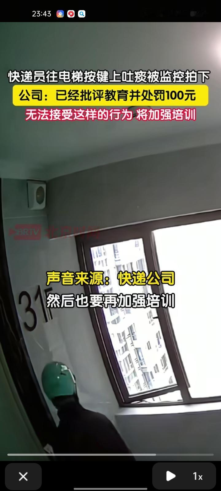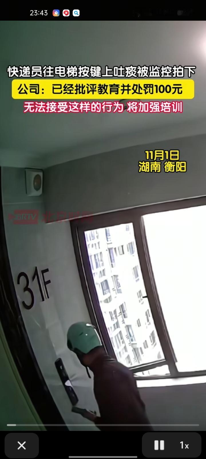 11月3日,湖南衡阳。网友晒视频称,自己当天外出,告知快递员把物品放门口取件。回家后发现电梯按键被吐痰,查监控发现是快递员干的,吐完痰就离开了。快递员起初狡辩,面对监控才承认。 中通快递部门回应称,已对快递员作批评教育,然后加强培训。公司领导给他骂了一顿,也处罚了他,他的行为无法不能接受。 快递员的职责是传递包裹,更是传递文明,干不文明的事情违背职业操守,更触碰了公序良俗的红线。希望公司要尽快做出行业规范警示,让每个快递员认识到,尊重他人、敬畏公共空间,才是立足的根本。